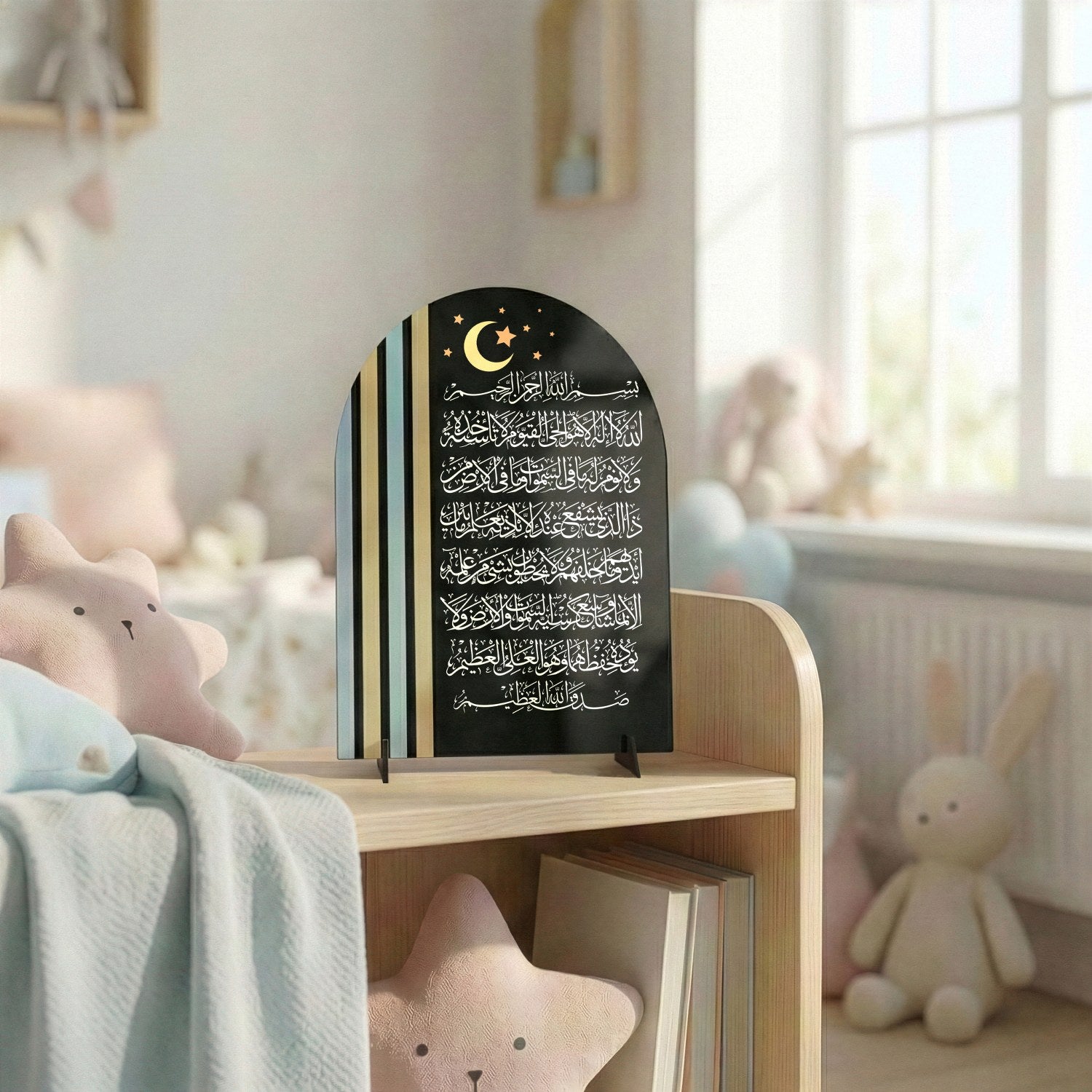 Ayetel Kürsi yazılı akrilik masaüstü stand, çocuk odaları için özel olarak tasarlanmış, manevi değeri yüksek ve huzur veren bir İslami dekor ürünüdür. Ayetel Kürsi’nin koruyucu ve anlamlı mesajı, yumuşak hatlara sahip kemer formu ve modern bir tasarım anlayışıyla sunulmuştur.