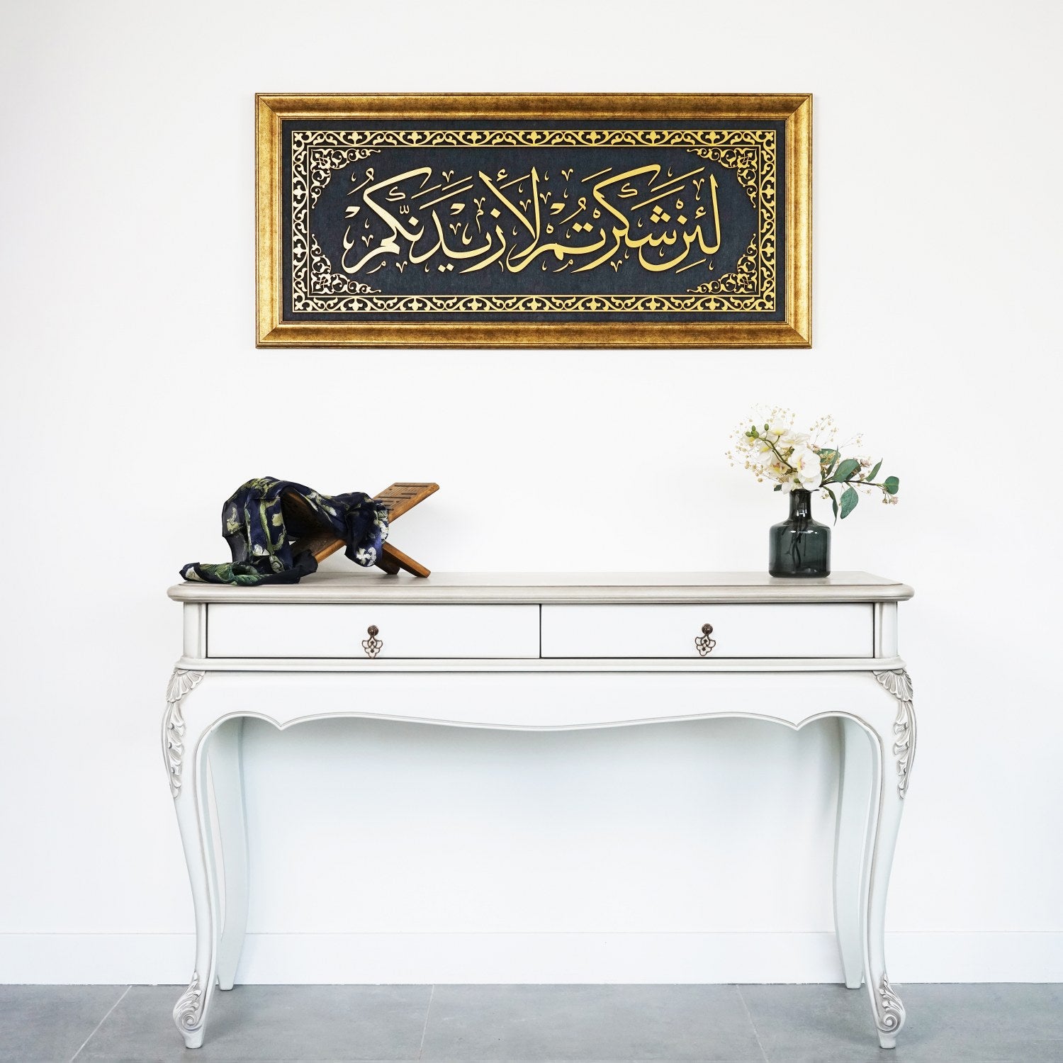 İbrahim suresi 7. ayetinin yer aldığı tablo, kadife kumaş üzerine lazer kesim ahşabın hat sanatıyla zarif bir şekilde işlenmesiyle oluşturulan el emeği bir üründür. Altın veya gümüş yaldızla renklendirilen ahşap detaylar, sağlam çerçevesiyle uzun ömürlü bir dekoratif parça olarak evinize değer katar. El işçiliğiyle özenle üretilen bu dini tablo, manevi anlamıyla iç huzur sağlar ve ev dekorasyonunuza estetik bir katkı sunar.