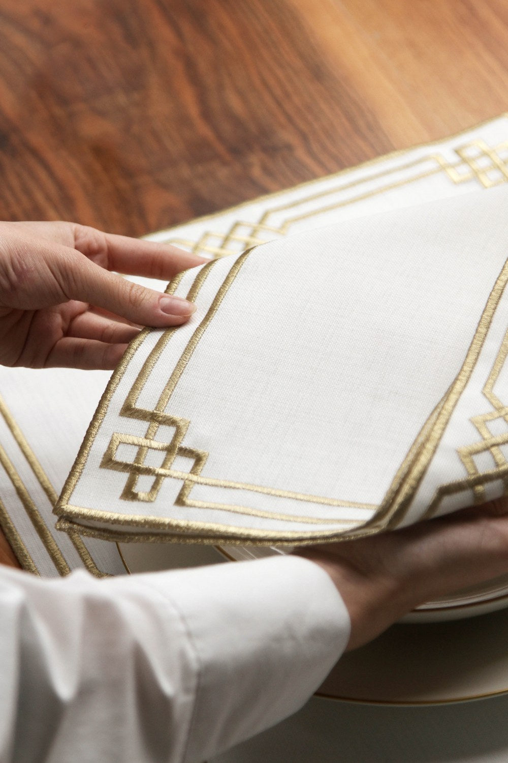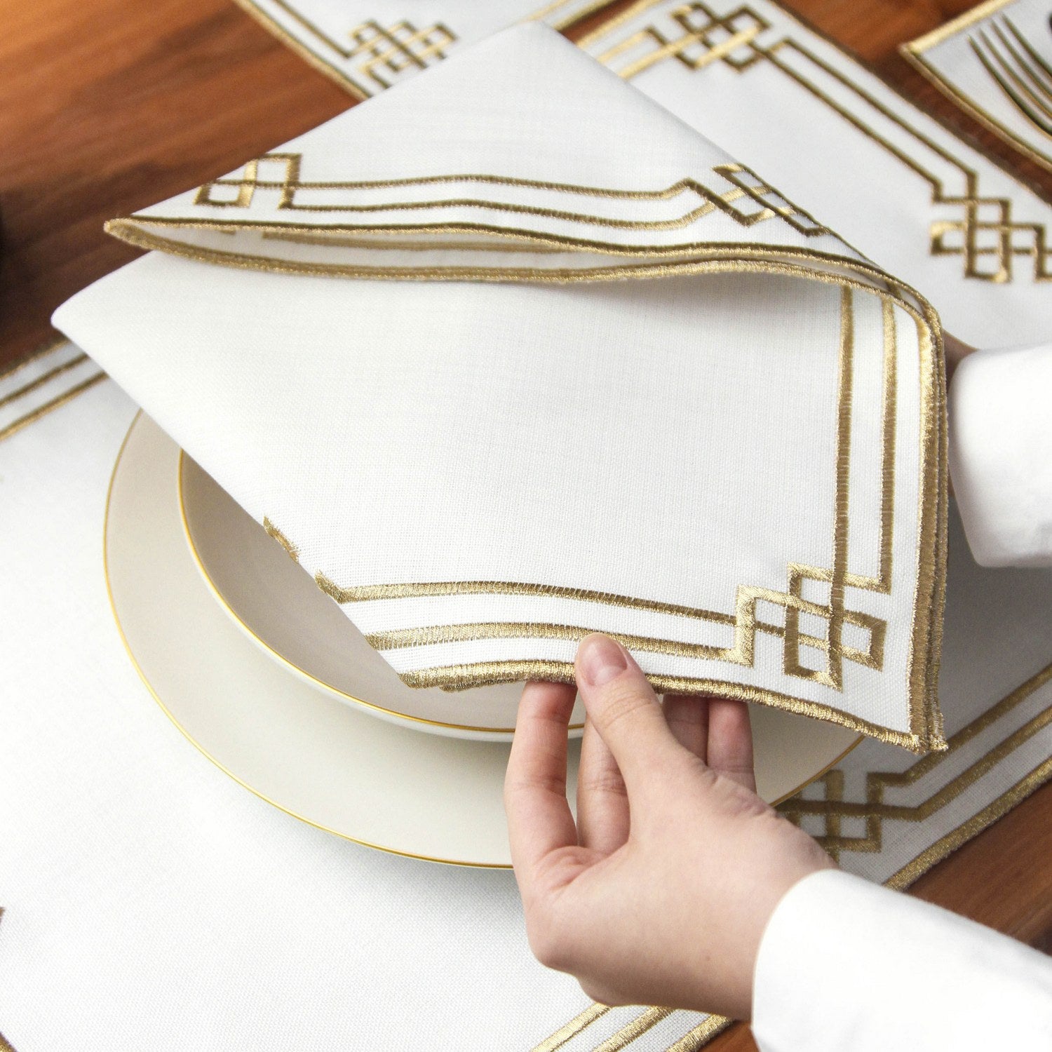 Lüks geometrik nakış işlemeli iftar sunum takımı, şıklığı ve zarafetiyle Ramazan sofralarınıza değer katıyor. Geometrik desenli nakışlarla tamamlanan 6 kişilik 24 parça set, davet sofralarına hem görsel uyum hem de düzen kazandırır. Amerikan servis, peçete ve çatal-bıçak keselerinden oluşan uyumlu parçalar, masa üzerinde bütünlük sağlar. Sade kumaş dokusu üzerine işlenen altın nakışlar, sofraya ölçülü bir estetik kazandırır. Ramazan boyunca her gün kullanılabileceği gibi, bayram sofralarında da şık bir tamamlayıcıdır.