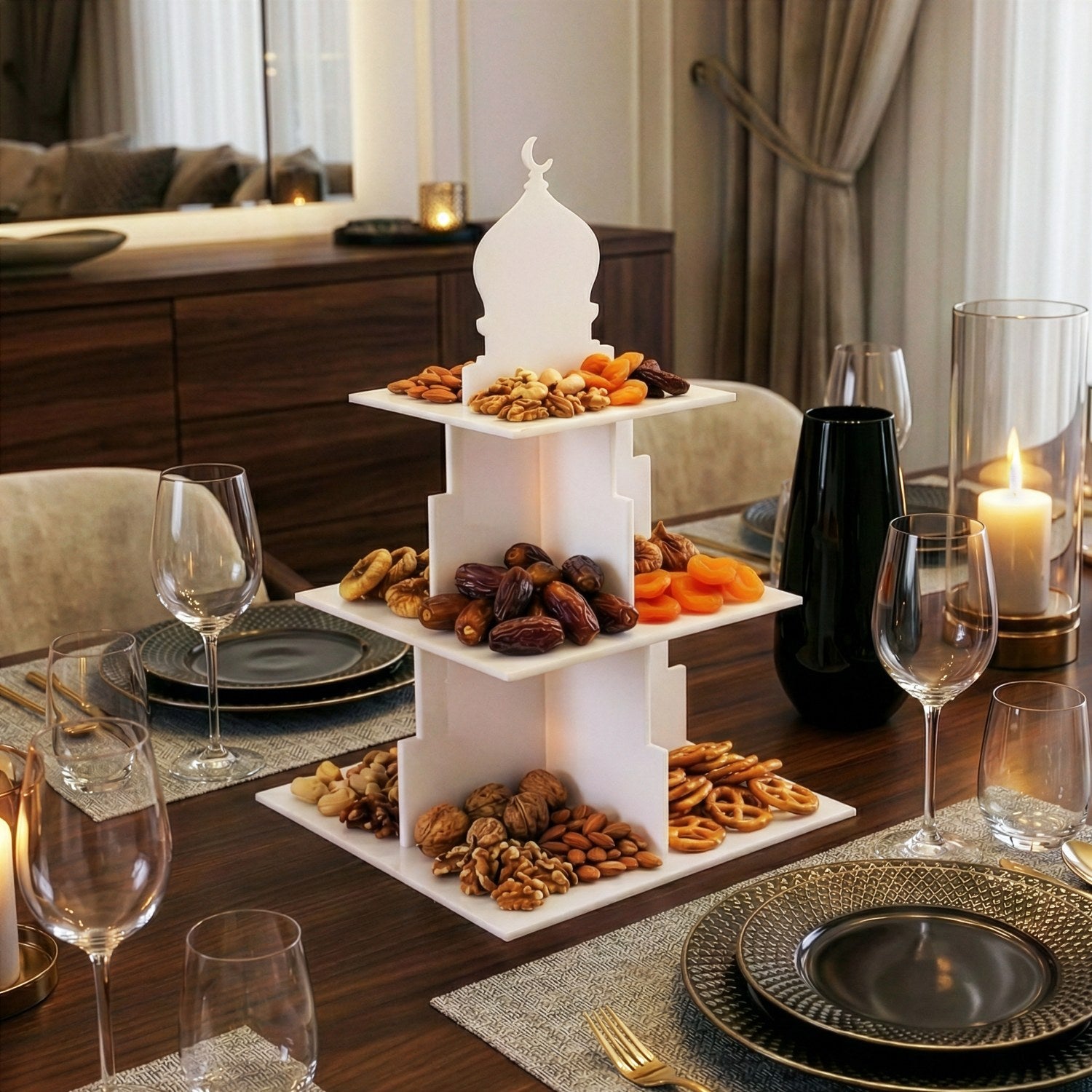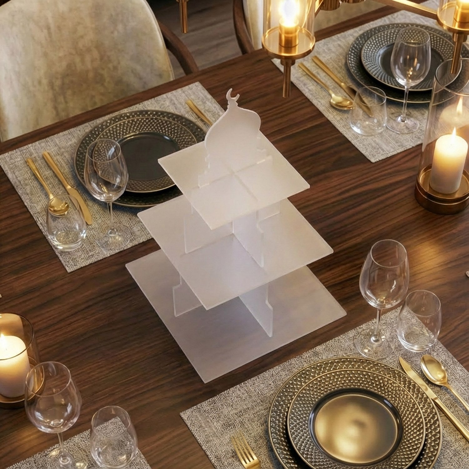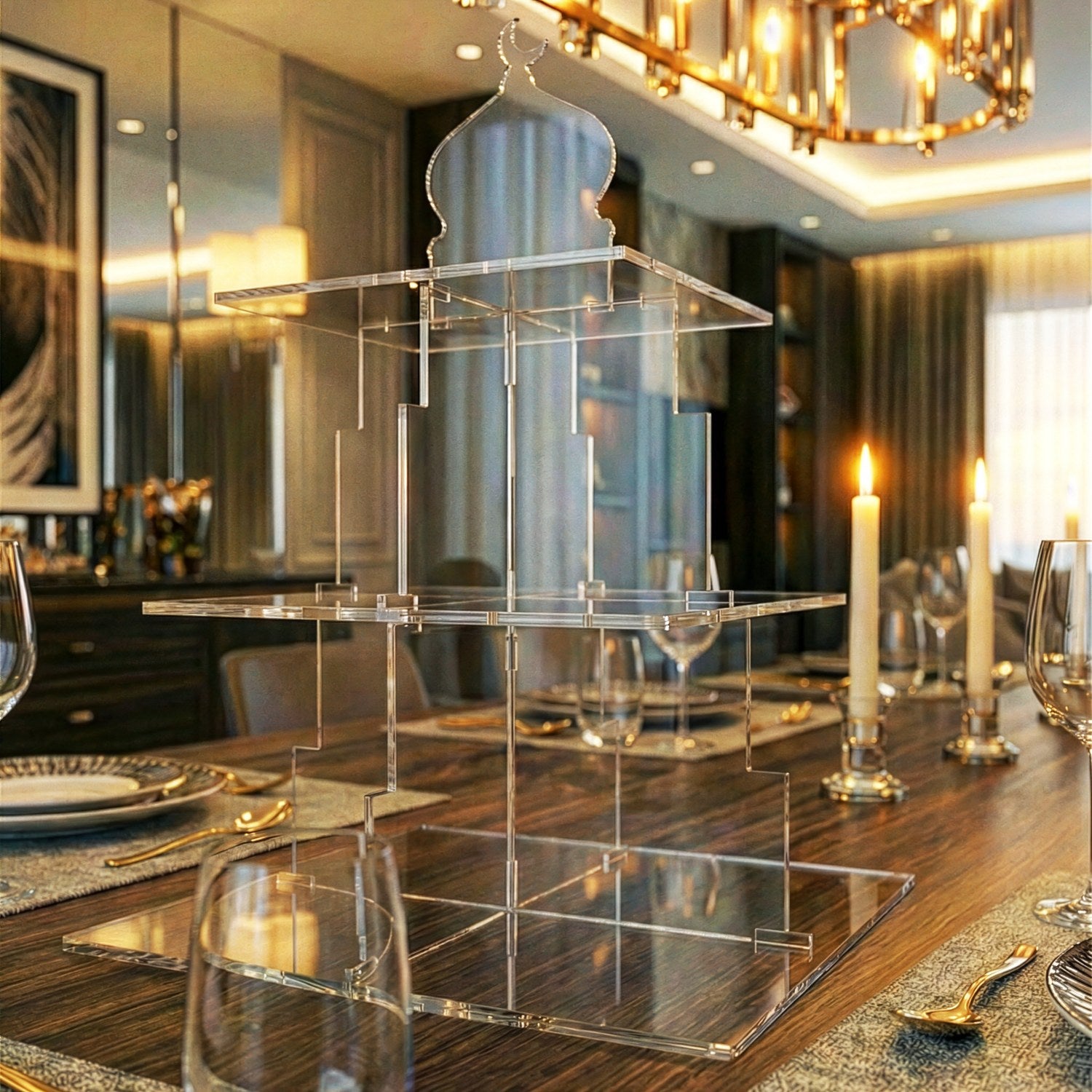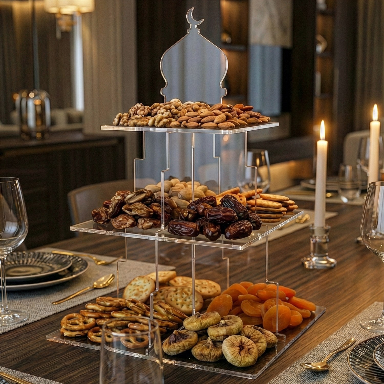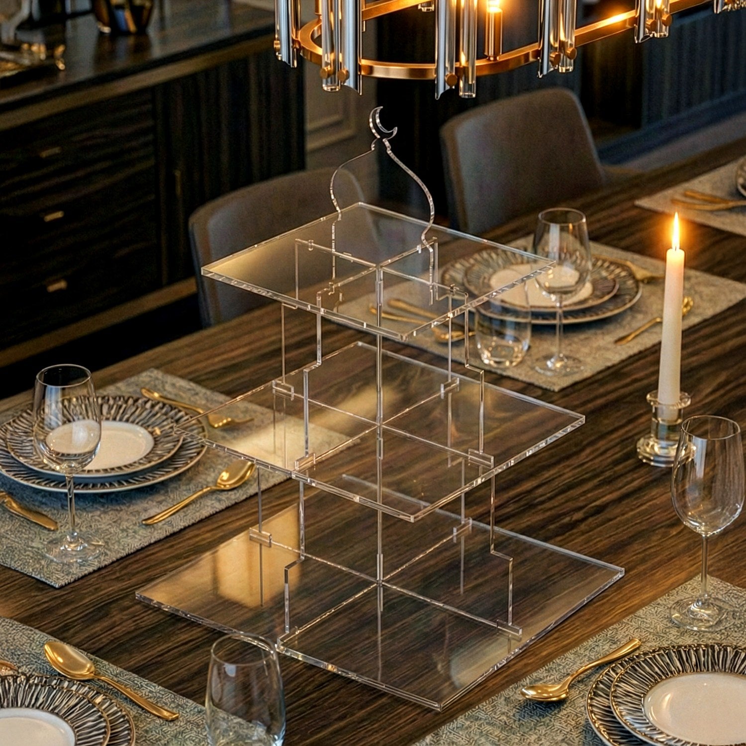 Ramazan sunum standı, modern tasarımı ve fonksiyonel katlı yapısıyla iftar sofralarınızda düzen ve estetiği bir araya getiriyor. Ramazan ayının bereketini sofralarınıza taşımak için özel olarak tasarlanmış pleksi stand, tatlılardan kuru meyvelere kadar farklı iftariyeliklerinizi şık bir şekilde sunmak için idealdir. Zarif kubbe formu, sofralarınıza manevi bir atmosfer katarken, her katı sayesinde ihtiyacınız olan tüm alanı sağlar.