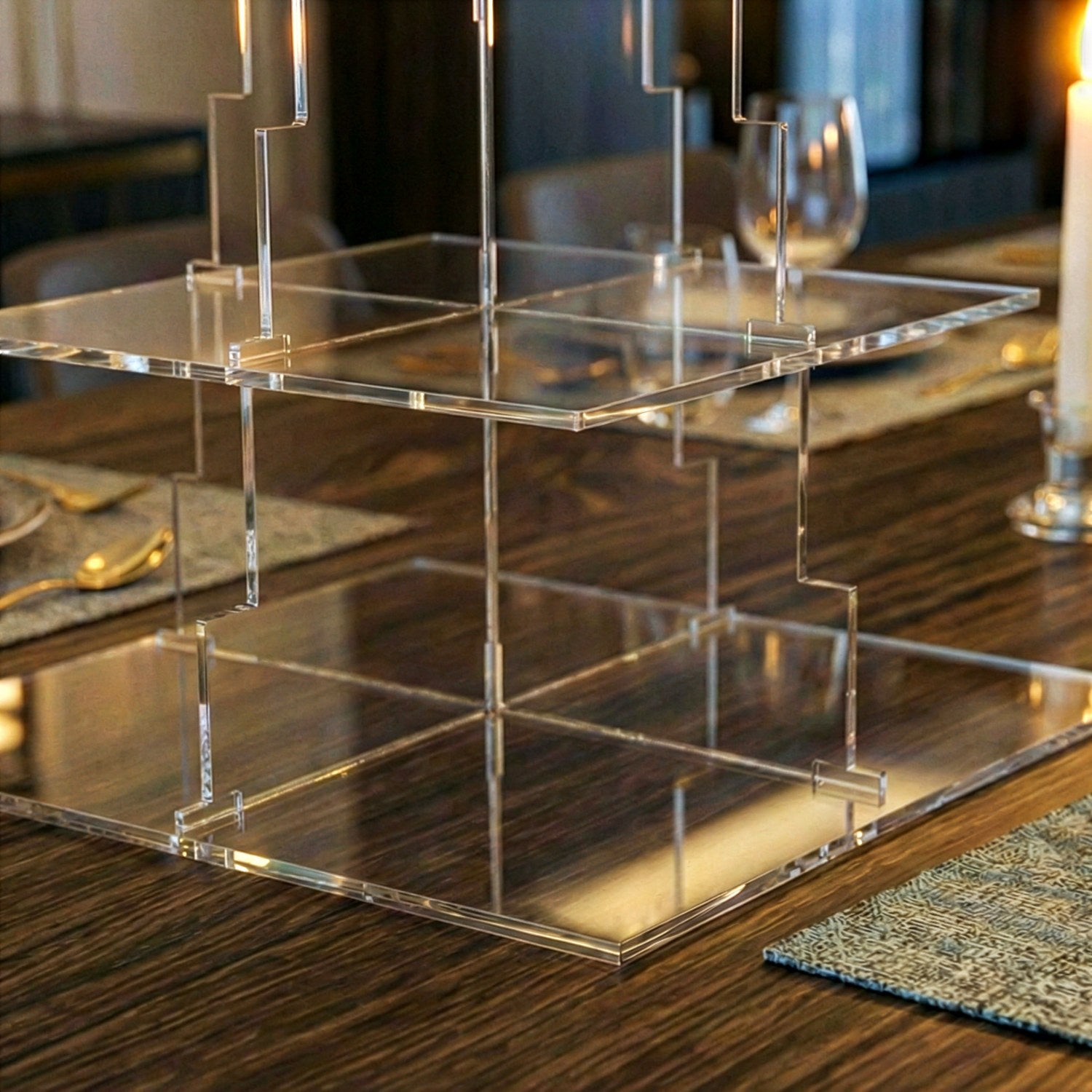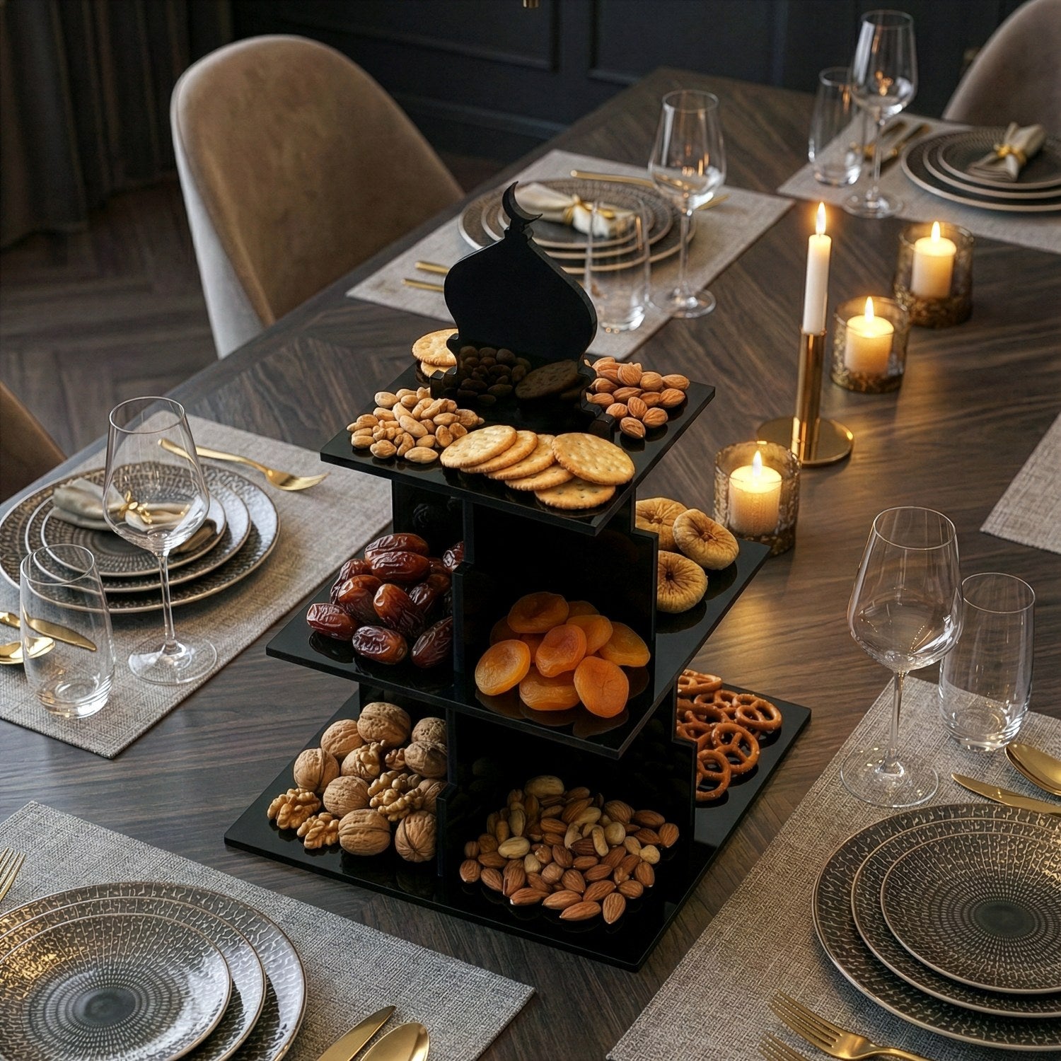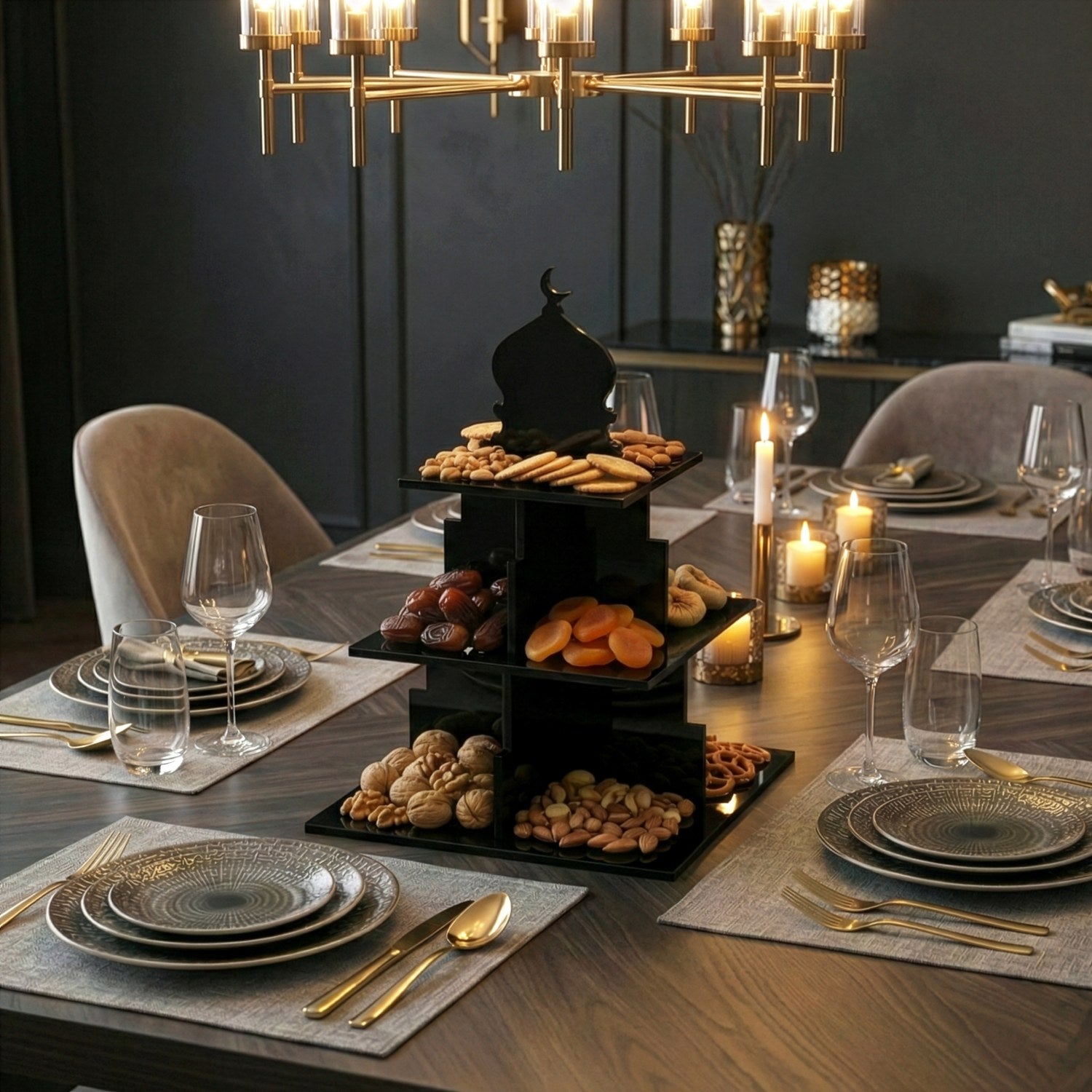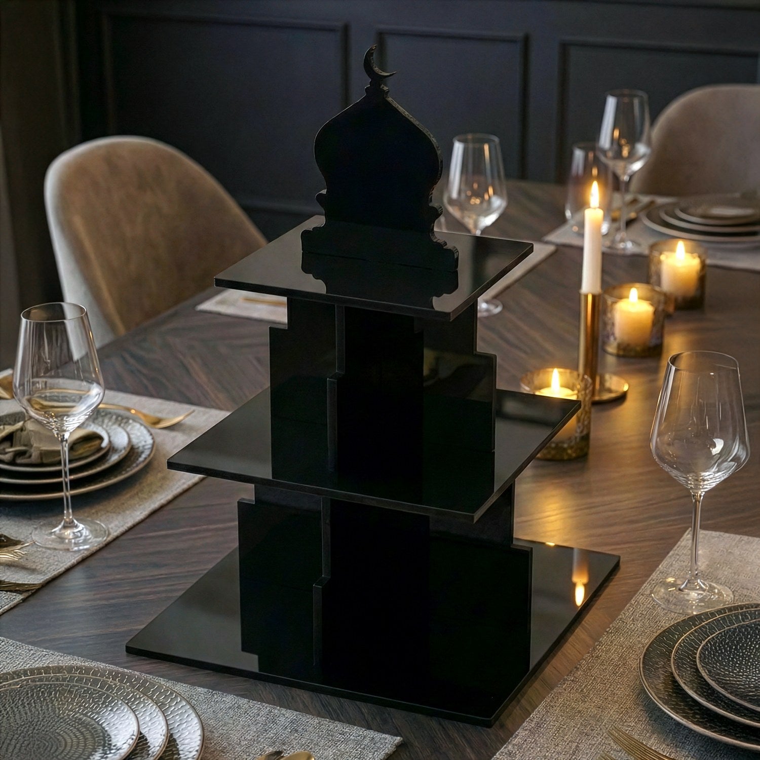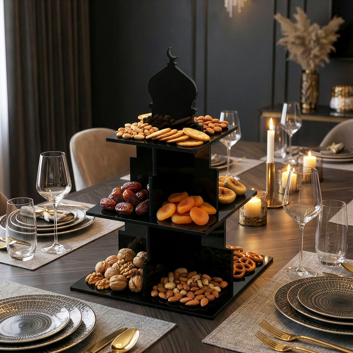 Ramazan sunum standı, modern tasarımı ve fonksiyonel katlı yapısıyla iftar sofralarınızda düzen ve estetiği bir araya getiriyor. Ramazan ayının bereketini sofralarınıza taşımak için özel olarak tasarlanmış pleksi stand, tatlılardan kuru meyvelere kadar farklı iftariyeliklerinizi şık bir şekilde sunmak için idealdir. Zarif kubbe formu, sofralarınıza manevi bir atmosfer katarken, her katı sayesinde ihtiyacınız olan tüm alanı sağlar.