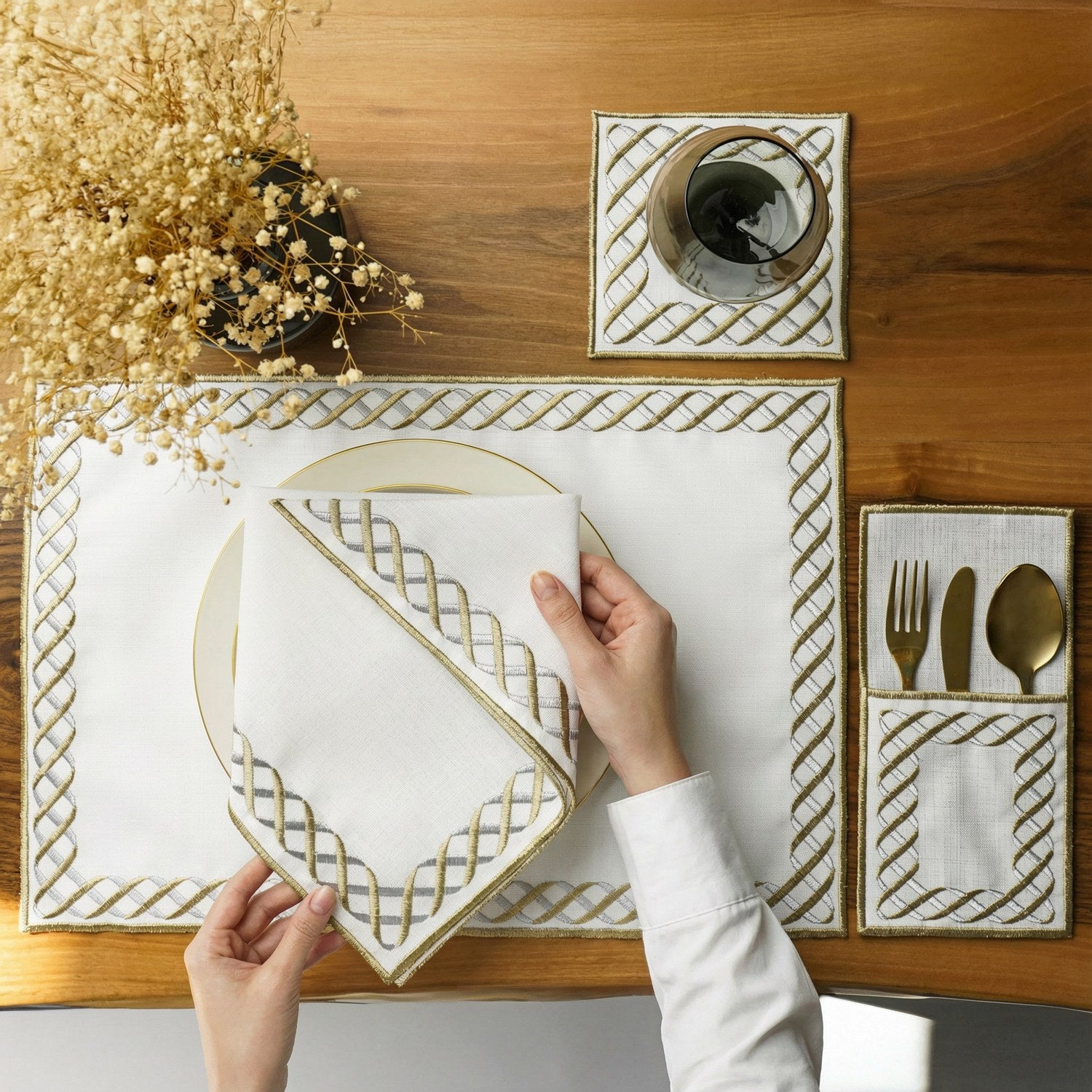 İslami Yemek Takımı setlerimizin içeriğinde, her bir parçadan 4 adet bulunmaktadır. Şık ve eksiksiz bir sunum için setimiz; 4 adet bardak altlığı, 4 adet çatal-bıçak kılıfı, 4 adet peçete ve 4 adet Amerikan servis (placemat) olmak üzere toplam 16 parçadan oluşmaktadır.