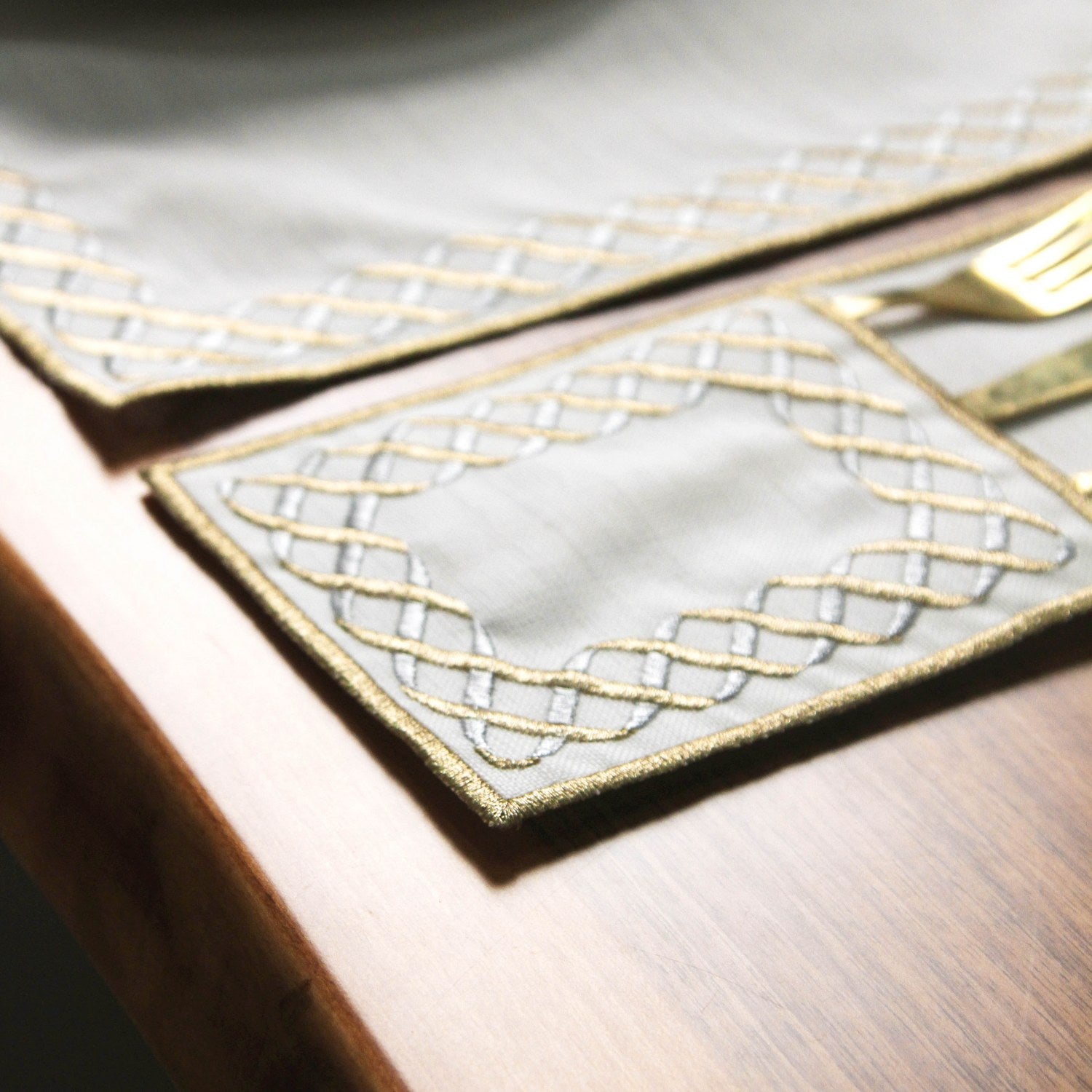İslami Yemek Takımı setlerimizde yer alan şık tasarımlar baskı değil, kumaş üzerine özenle işlenmiş nakış detaylarıdır. Dekorasyonunuza en uygun seçimi yapabilmeniz için Gümüş ve Altın renk seçenekleriyle sunulmaktadır.