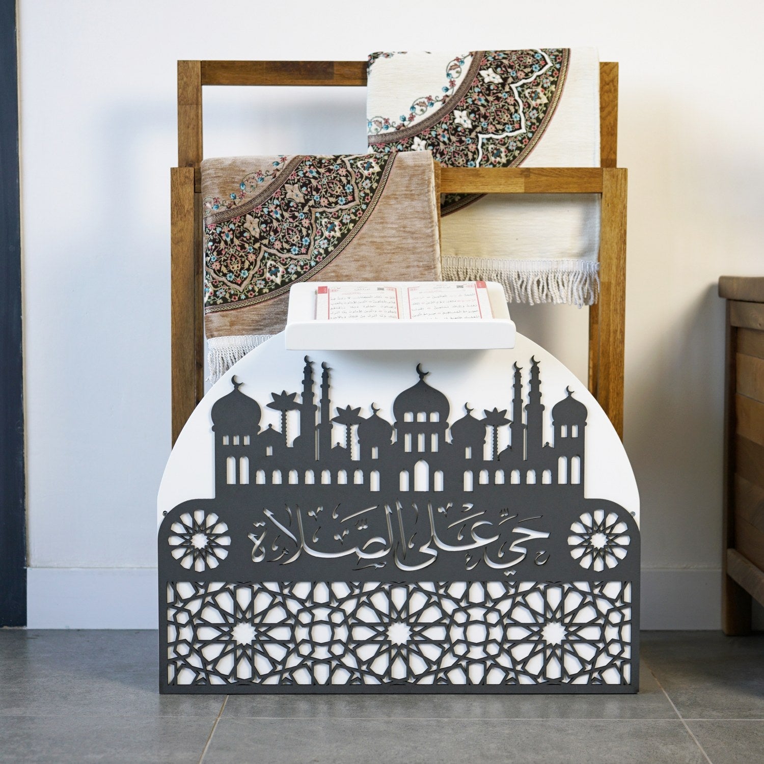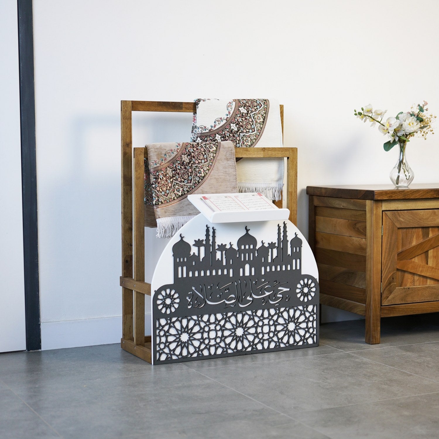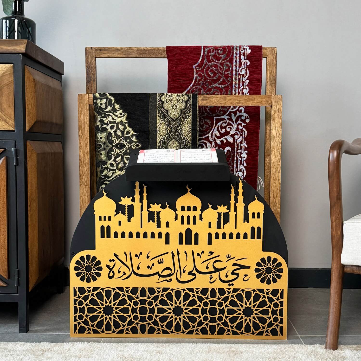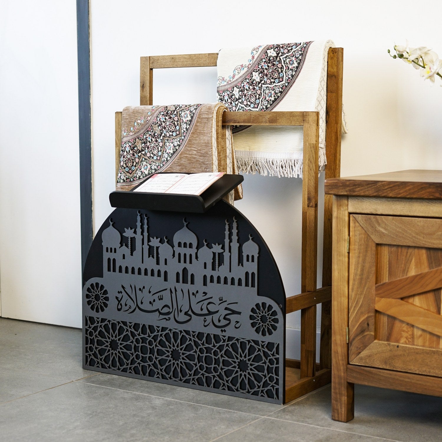 Ahşap seccadelik ve rahle seti, ibadet anlarınızı anlamlı ve düzenli kılmak için ustalıkla tasarlanmıştır. El işçiliğiyle üretilen seccade standı emek, estetik, maneviyat ve işlevselliği bir araya getirir. Hayye ale's Salah yazısı ile sizi namaza çağıran zarif bir hatırlatıcıdır.