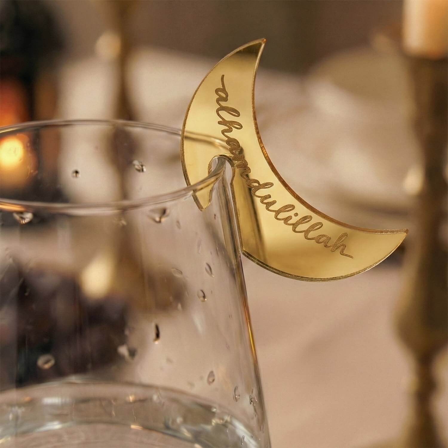 Hilal formlu bardak süslerimiz ile iftar ve bayram sofralarınıza özenli ve kişiselleştirilmiş bir dokunuş katın. Yüksek kaliteli aynalı akrilikten hassas bir şekilde kesilen bu zarif süsler, su kadehlerinden çay bardaklarına kadar her türlü bardağın kenarına mükemmel şekilde oturacak şekilde tasarlanmıştır. 6'lı ve 12'li set seçenekleriyle sunulan bu aksesuarlar, kalabalık davetlerinizde hem pratik bir çözüm hem de göz alıcı estetik katar.