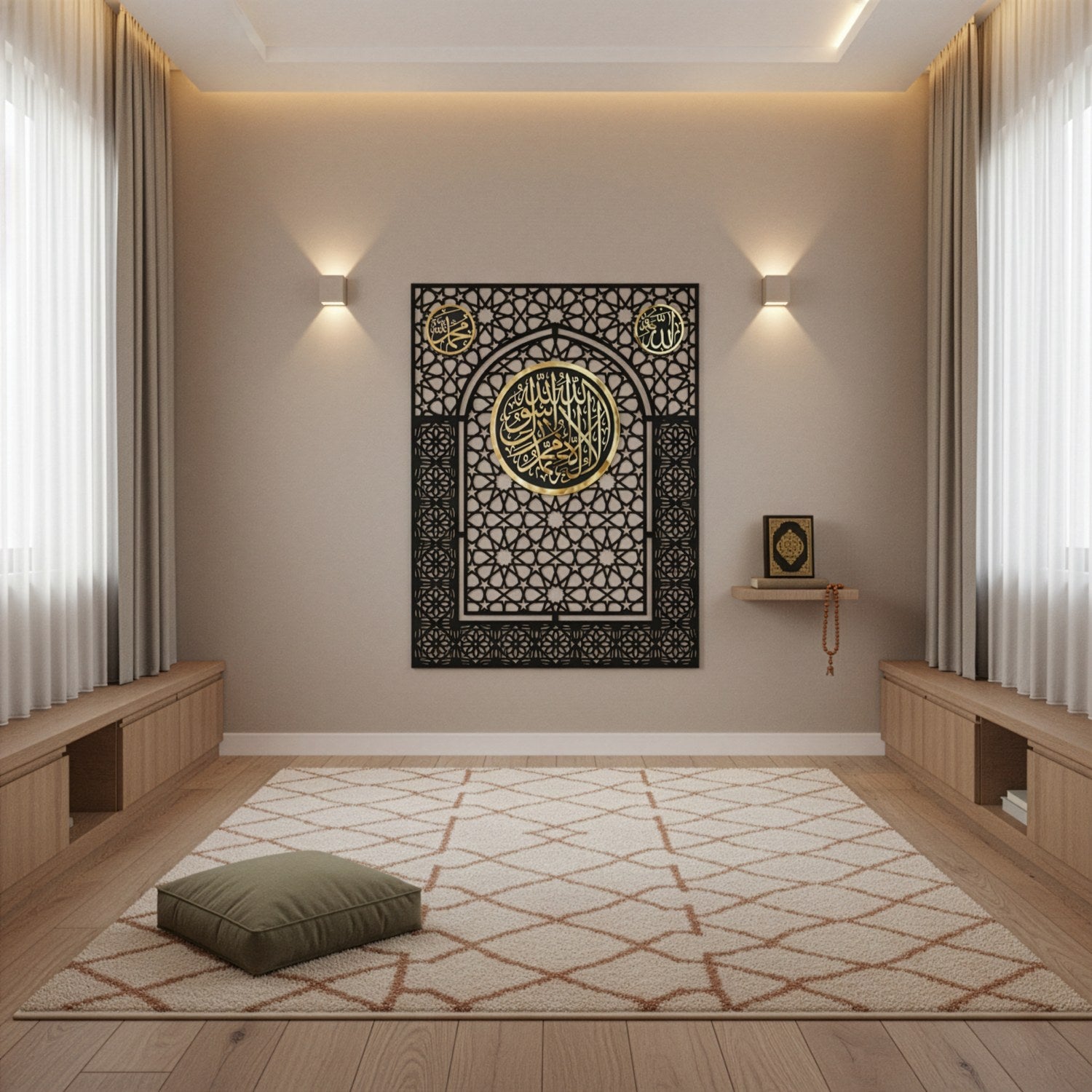 kelime i tevhid ile allah muhammed lafizlari altin pleksi ile islenmis cicek ve yildiz motifli ahsap siyah mihrap namaz odasinda goz alici bir durus sergiliyor islamicwallarttr