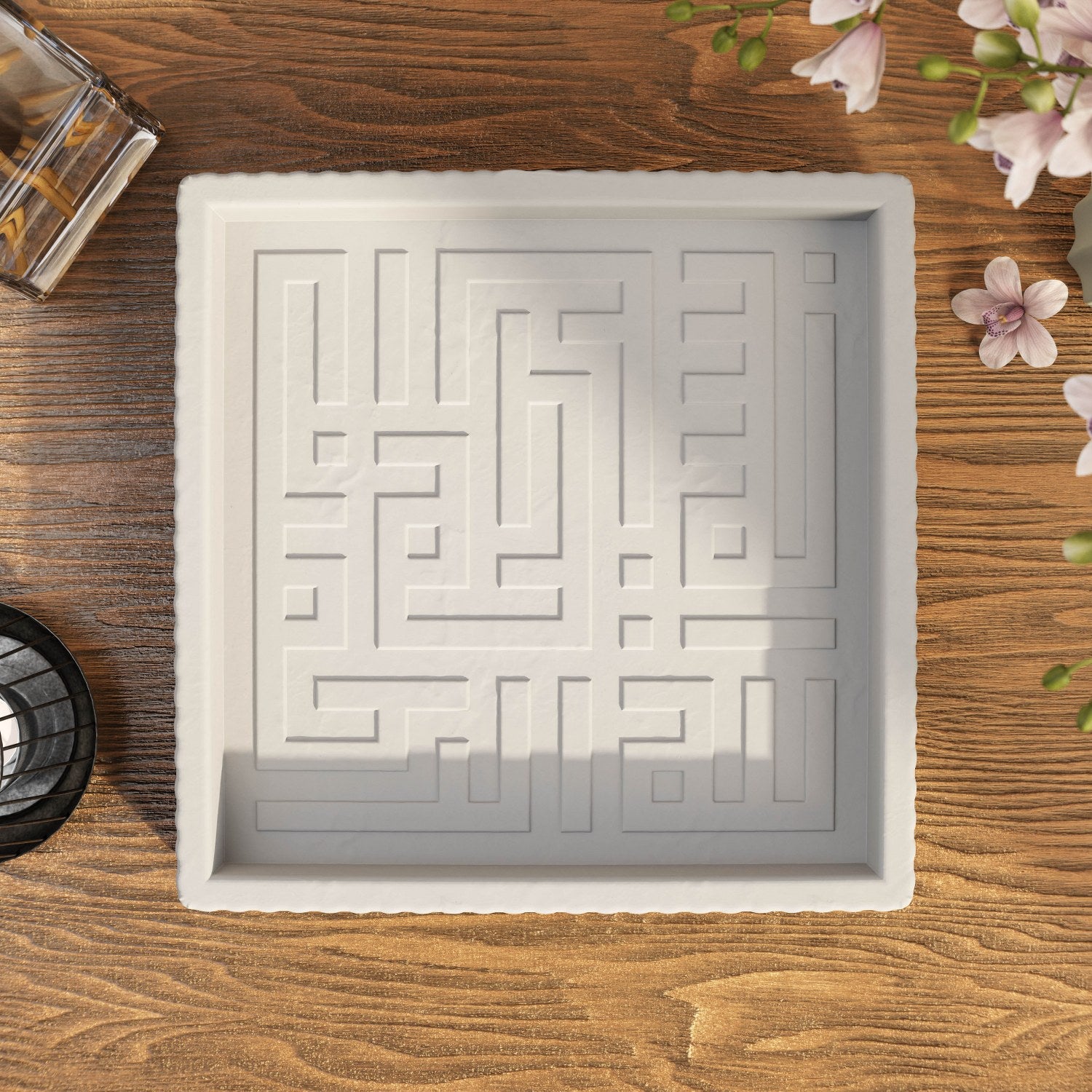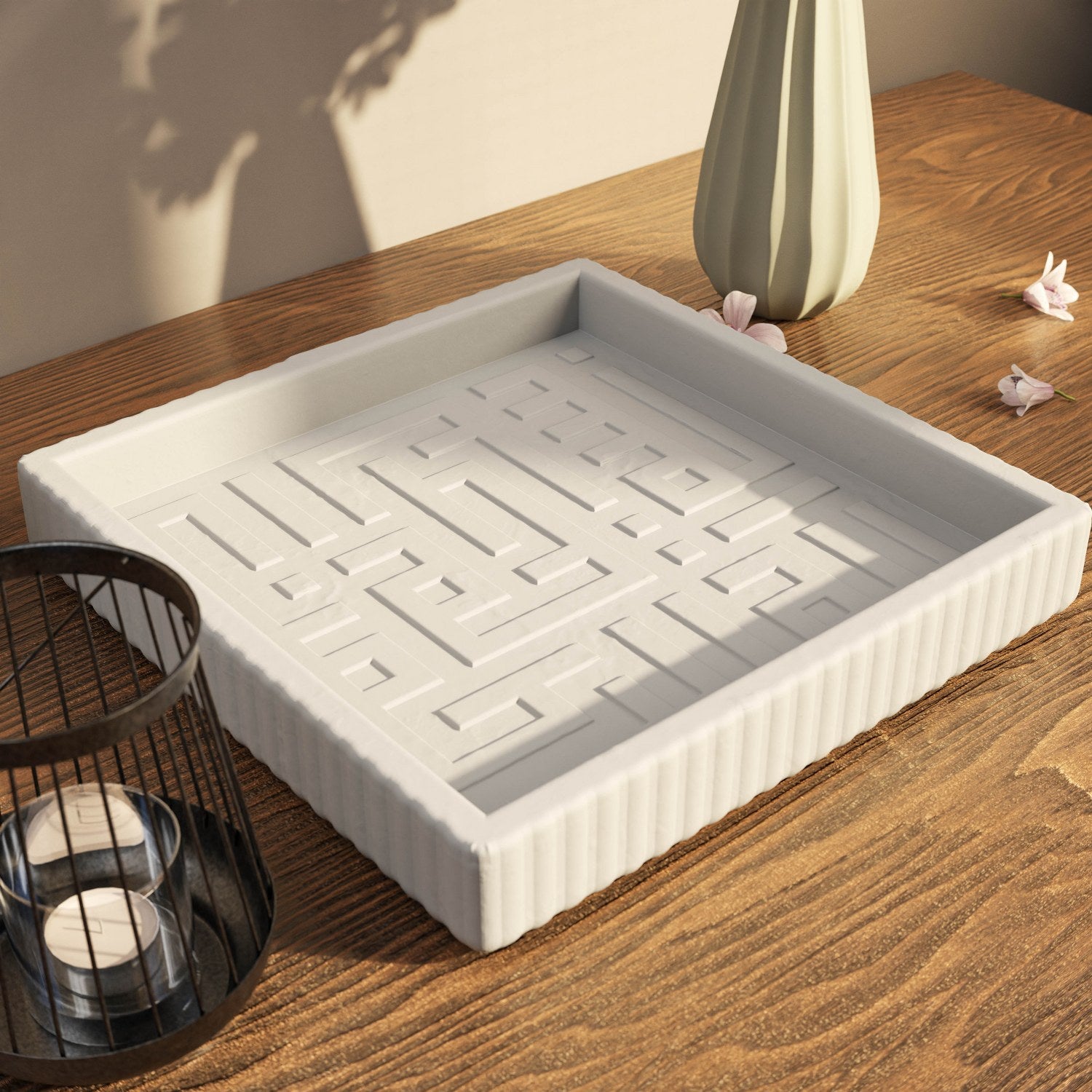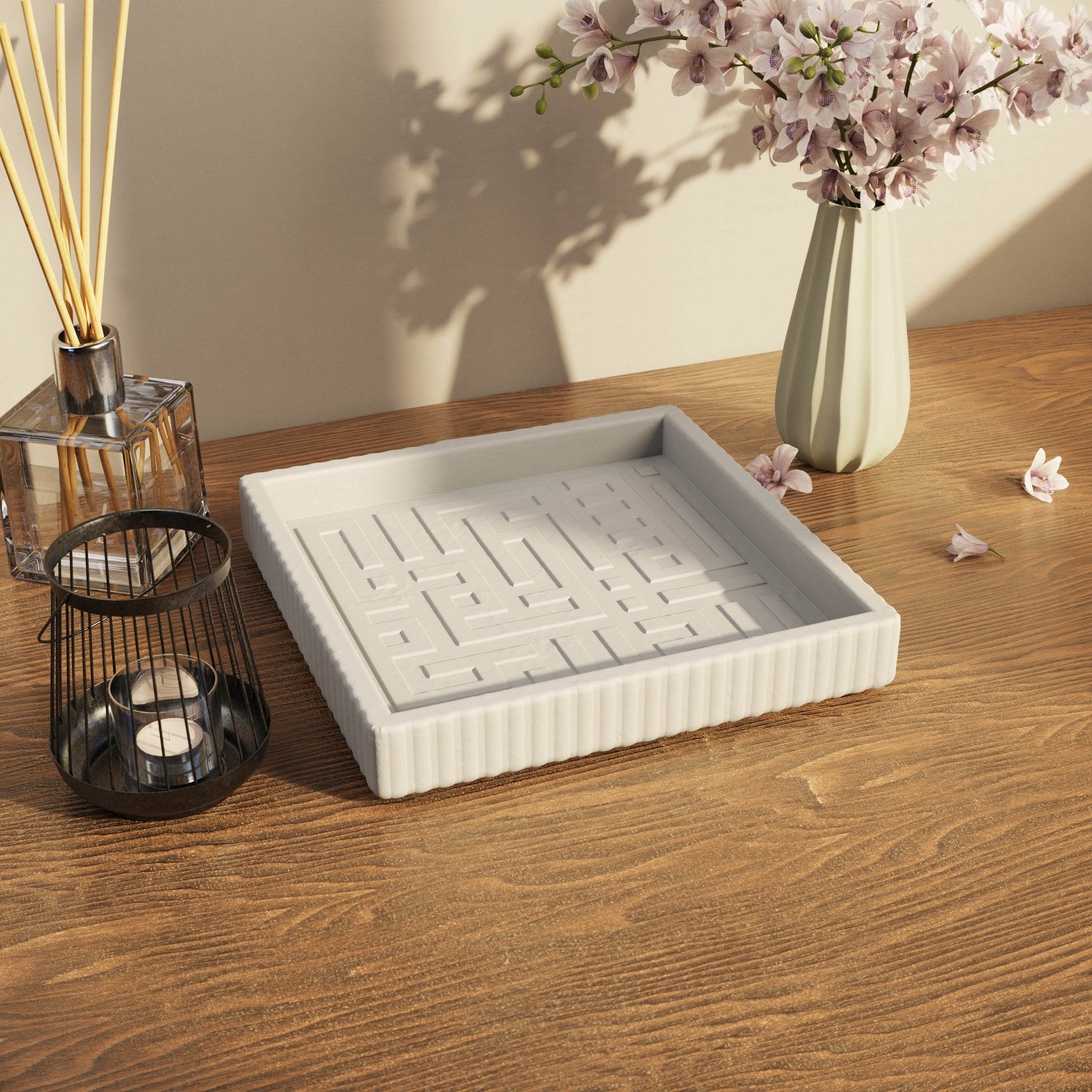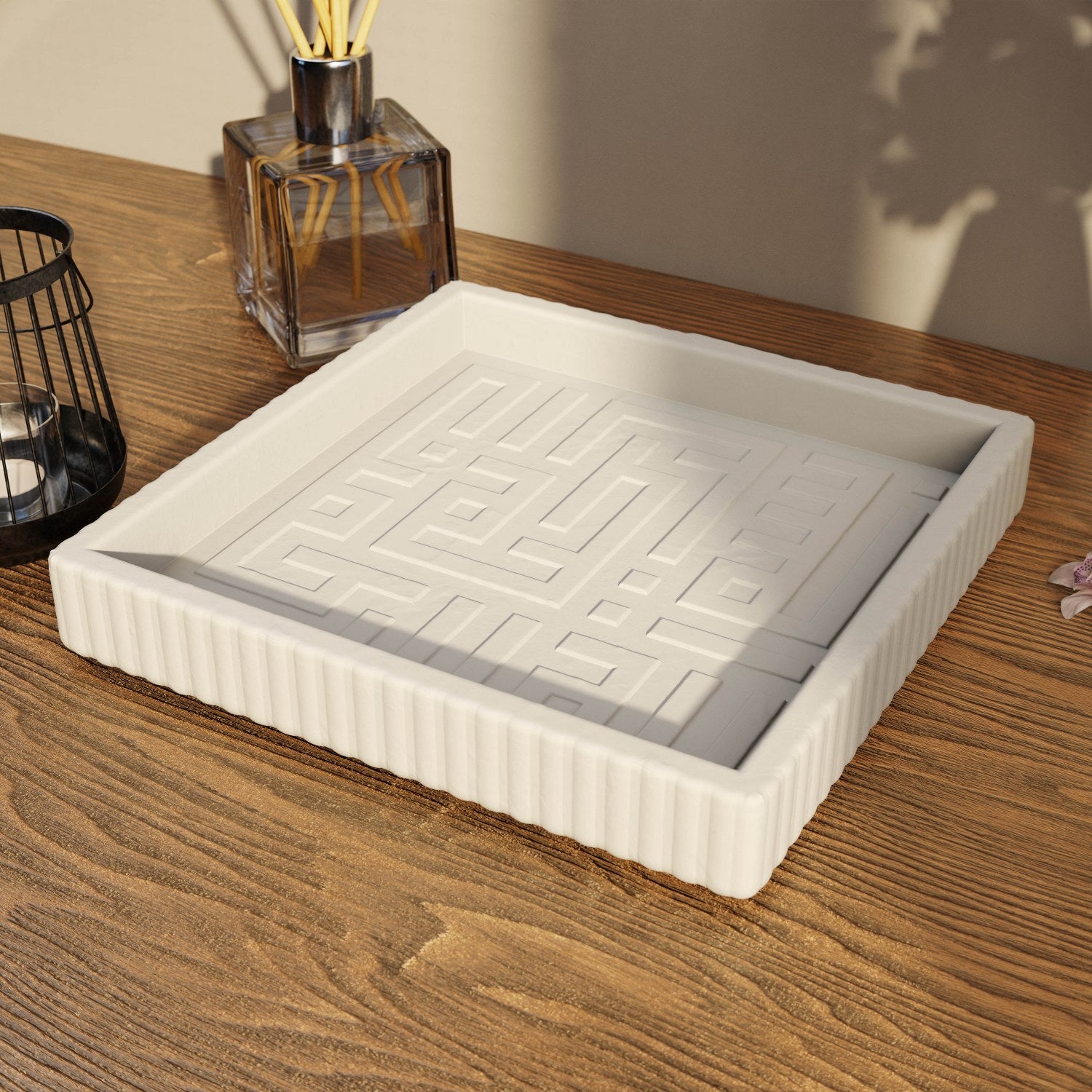 Besmele işlemeli taş tozu dekoratif tabak, İslam sanatının en köklü yazı stillerinden biri olan kufi hat ile işlenmiş Besmele’yi, çağdaş bir dekoratif formda sunar. Köşeli, dengeli ve mimari karaktere sahip kufi yazı, ürüne güçlü bir estetik kazandırır. Taş tozu malzeme ile üretilen bu kare formdaki dekoratif tabak, mat yüzeyi ve beyaz rengi sayesinde modern, minimalist ve İslami dekor anlayışıyla uyum sağlar.