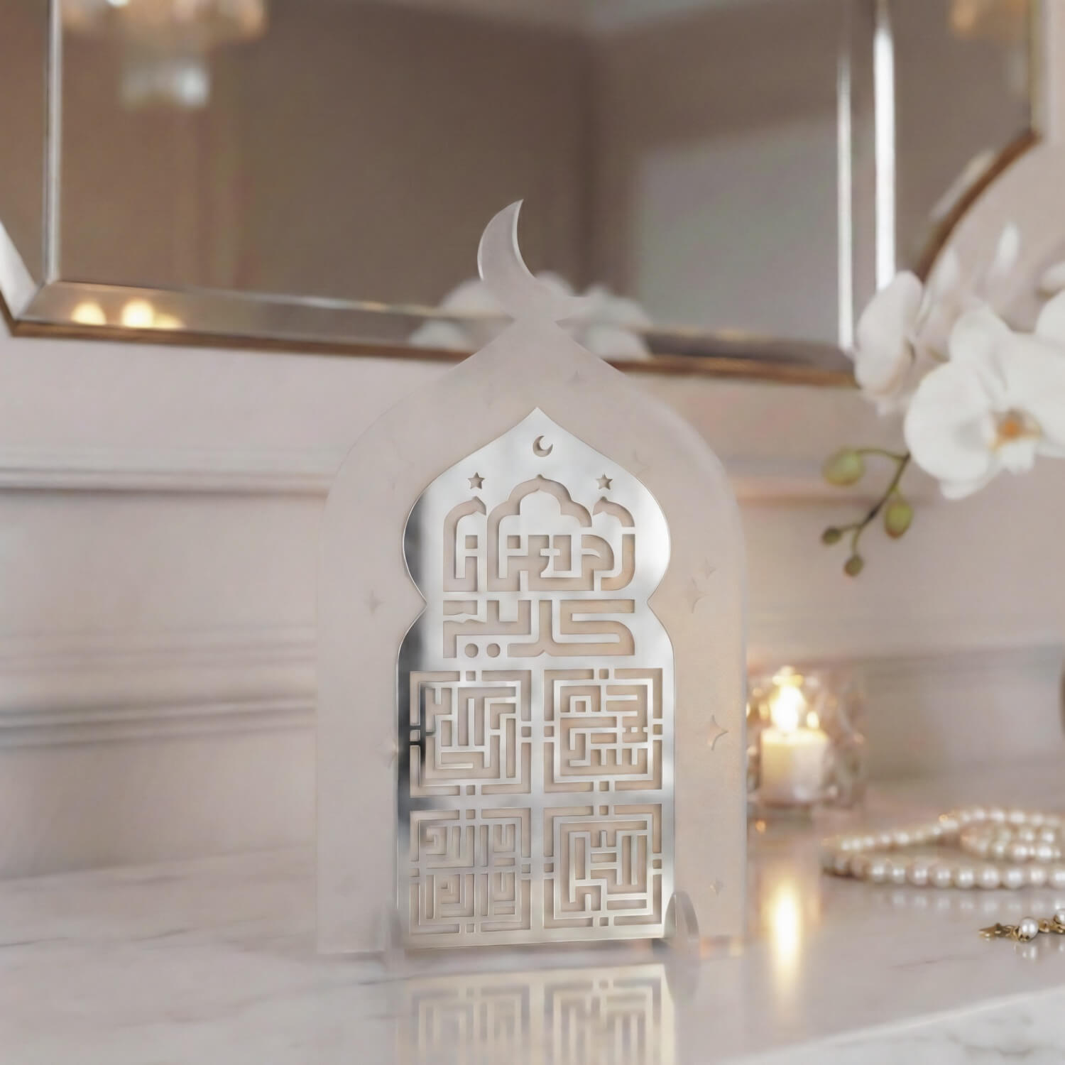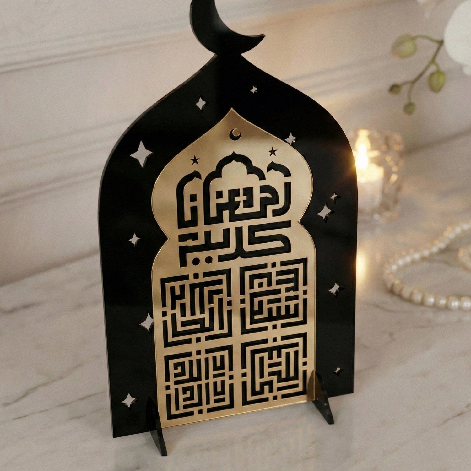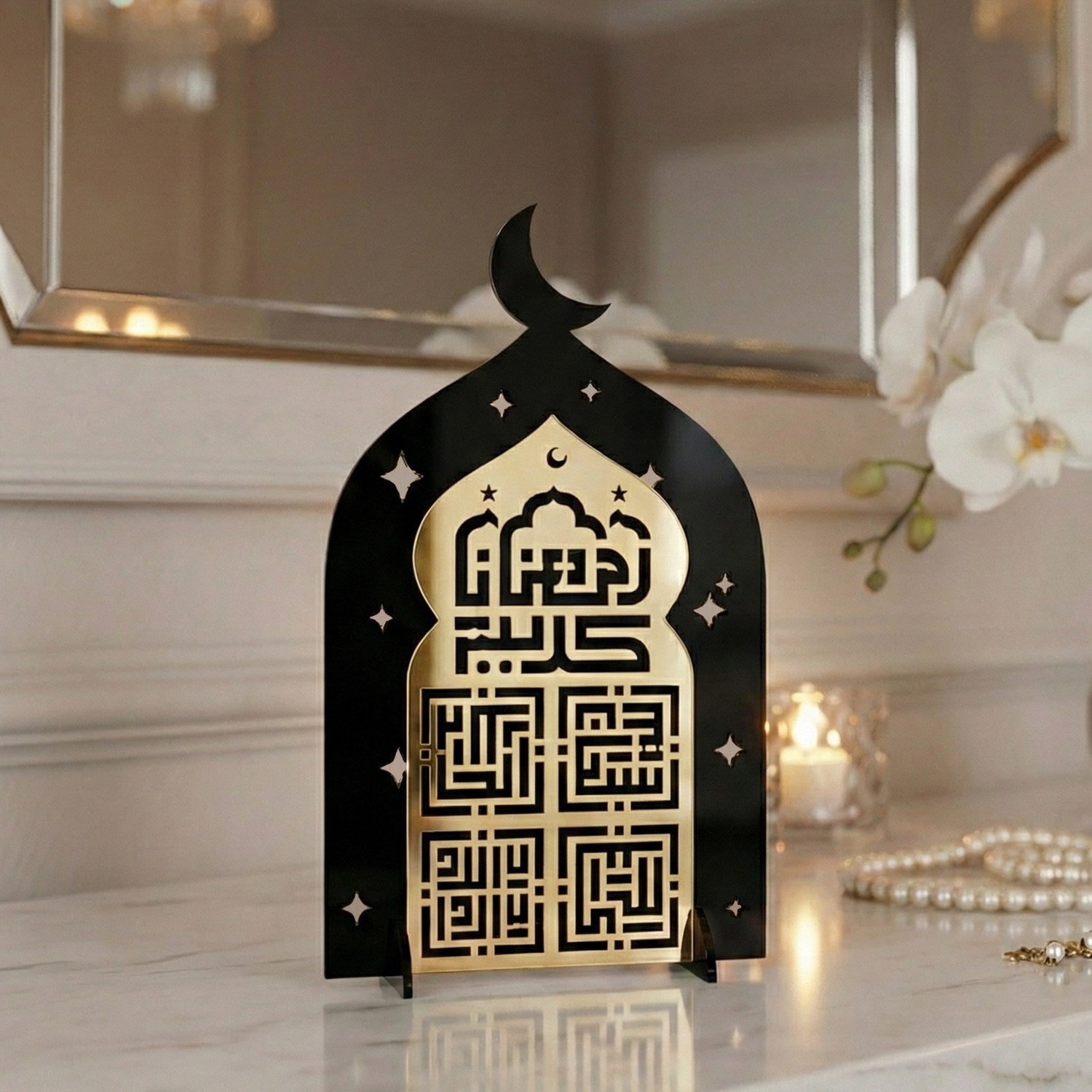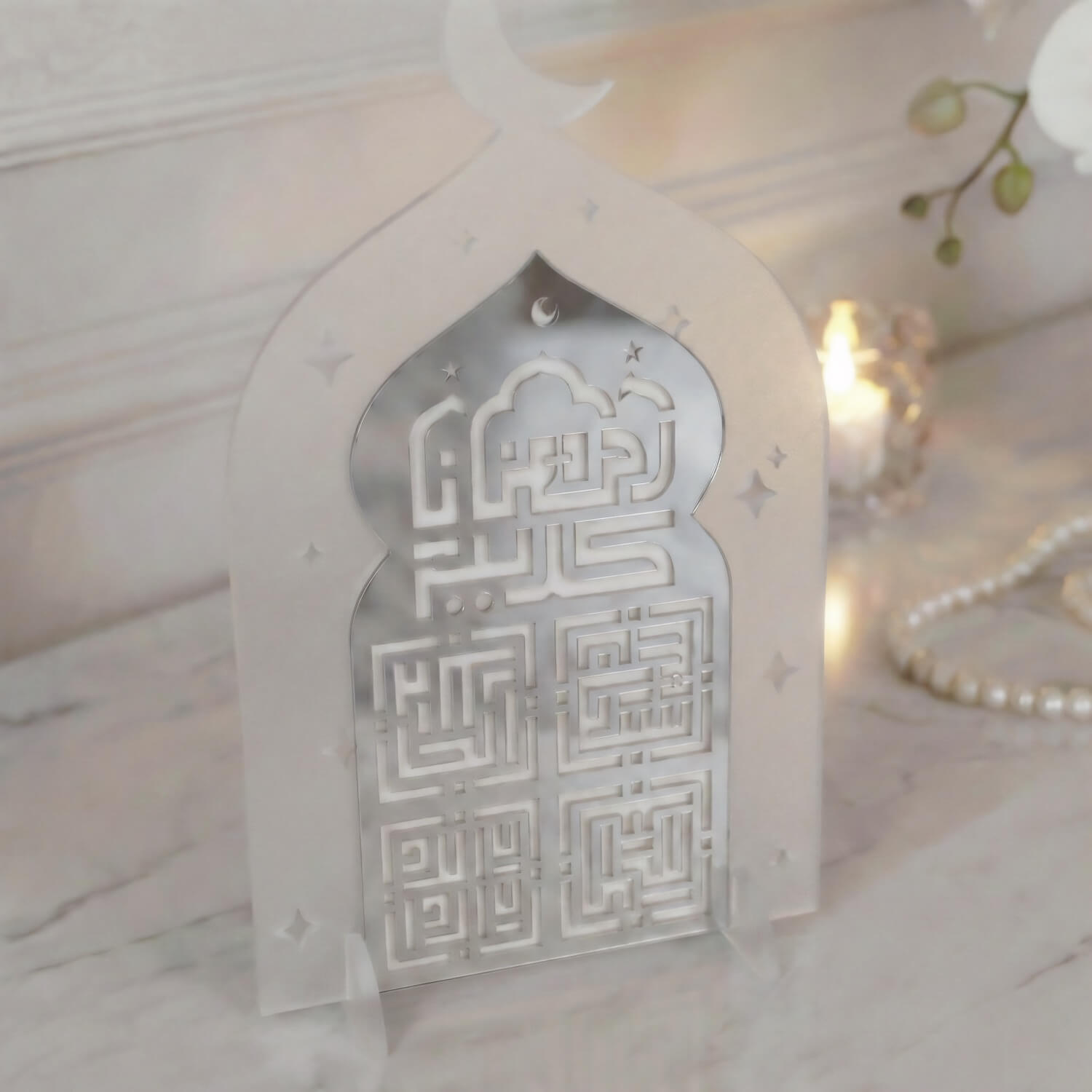 Cami formundan ilham alan siluet, İslami mimarinin simgesel estetiğini yansıtırken; kufi hat yazı stili tasarıma ikonik bir duruş kazandırır. Akrilik malzemeden üretilen stand; hafif, dayanıklı ve modern yapısıyla masa, konsol, raf veya vitrin üzerinde rahatlıkla sergilenebilir. Özellikle Ramazan döneminde ev dekorasyonlarında odak noktası olacak şekilde tasarlanmıştır.