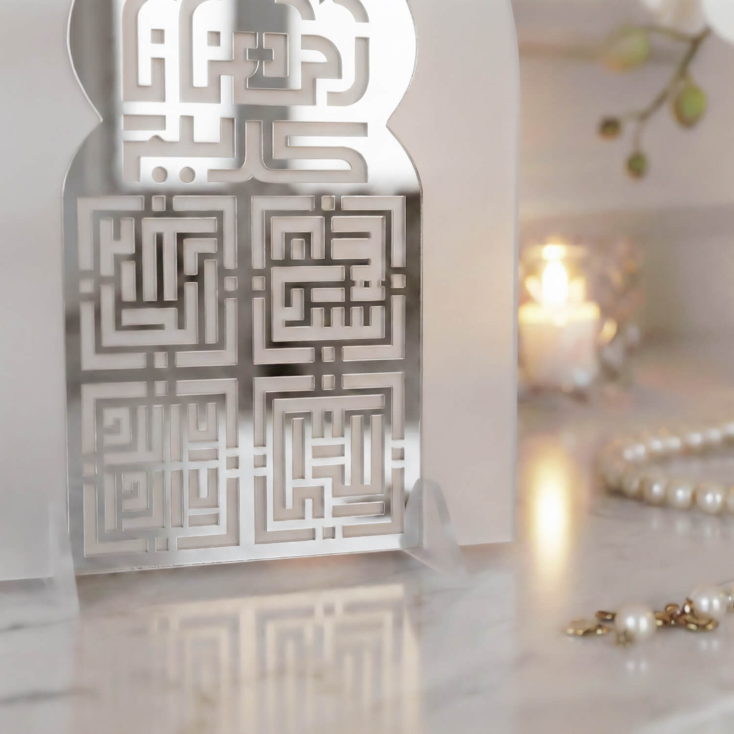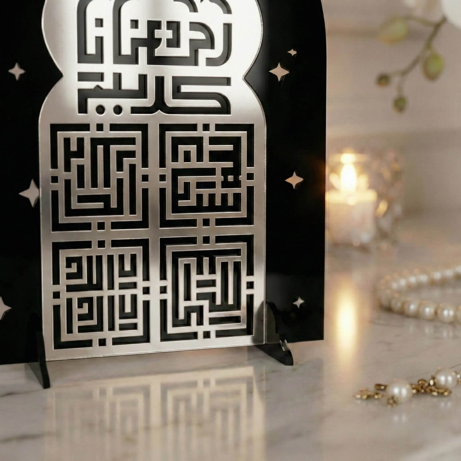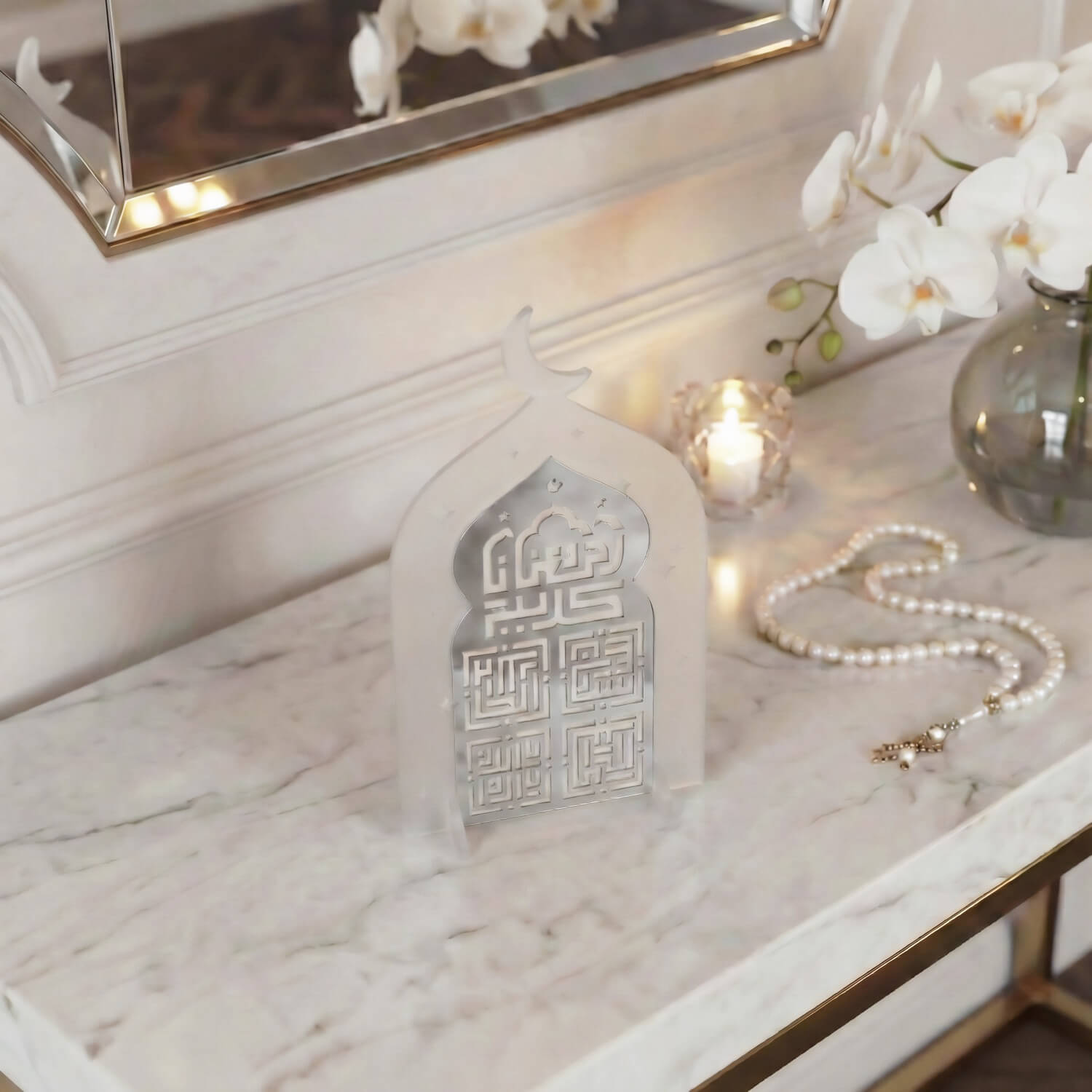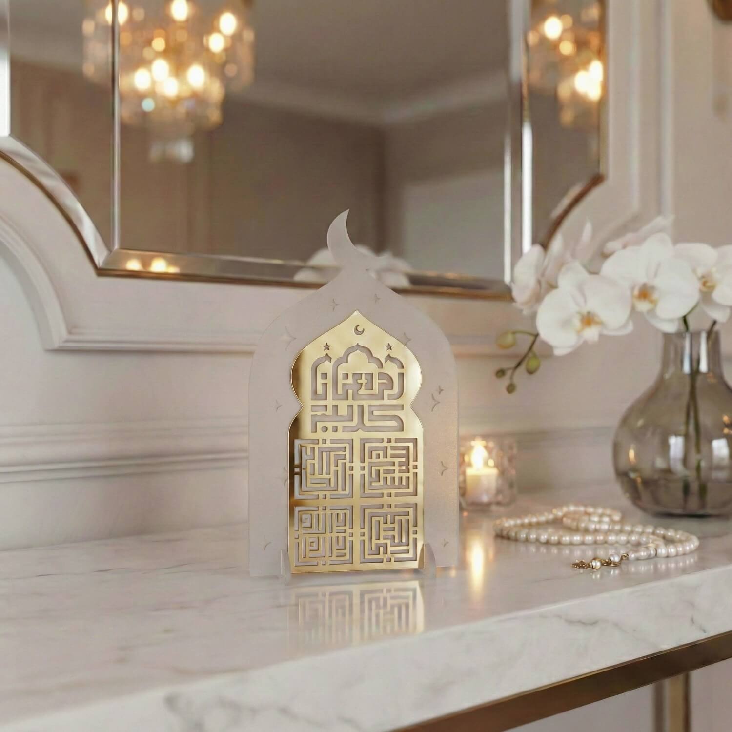 Cami formundan ilham alan siluet, İslami mimarinin simgesel estetiğini yansıtırken; kufi hat yazı stili tasarıma ikonik bir duruş kazandırır. Akrilik malzemeden üretilen stand; hafif, dayanıklı ve modern yapısıyla masa, konsol, raf veya vitrin üzerinde rahatlıkla sergilenebilir. Özellikle Ramazan döneminde ev dekorasyonlarında odak noktası olacak şekilde tasarlanmıştır.