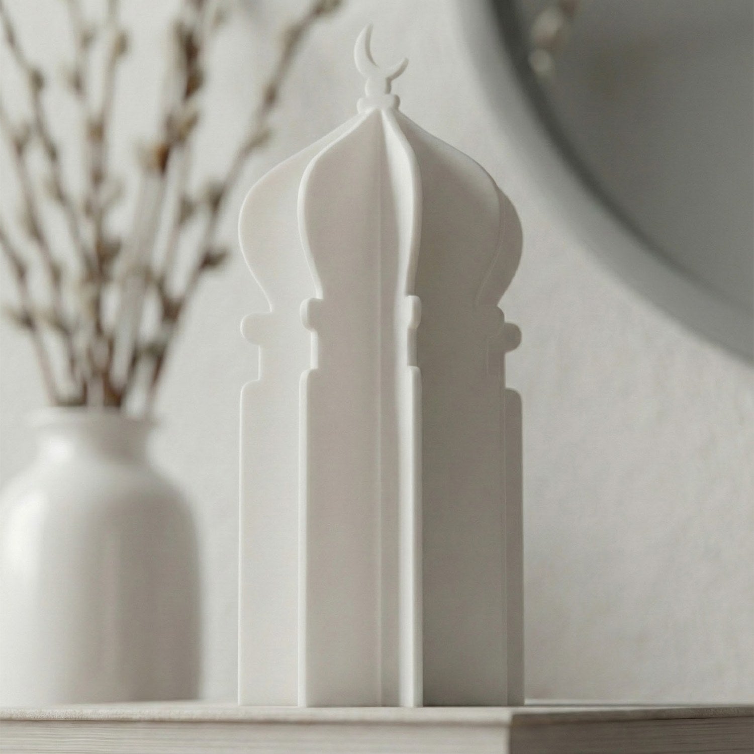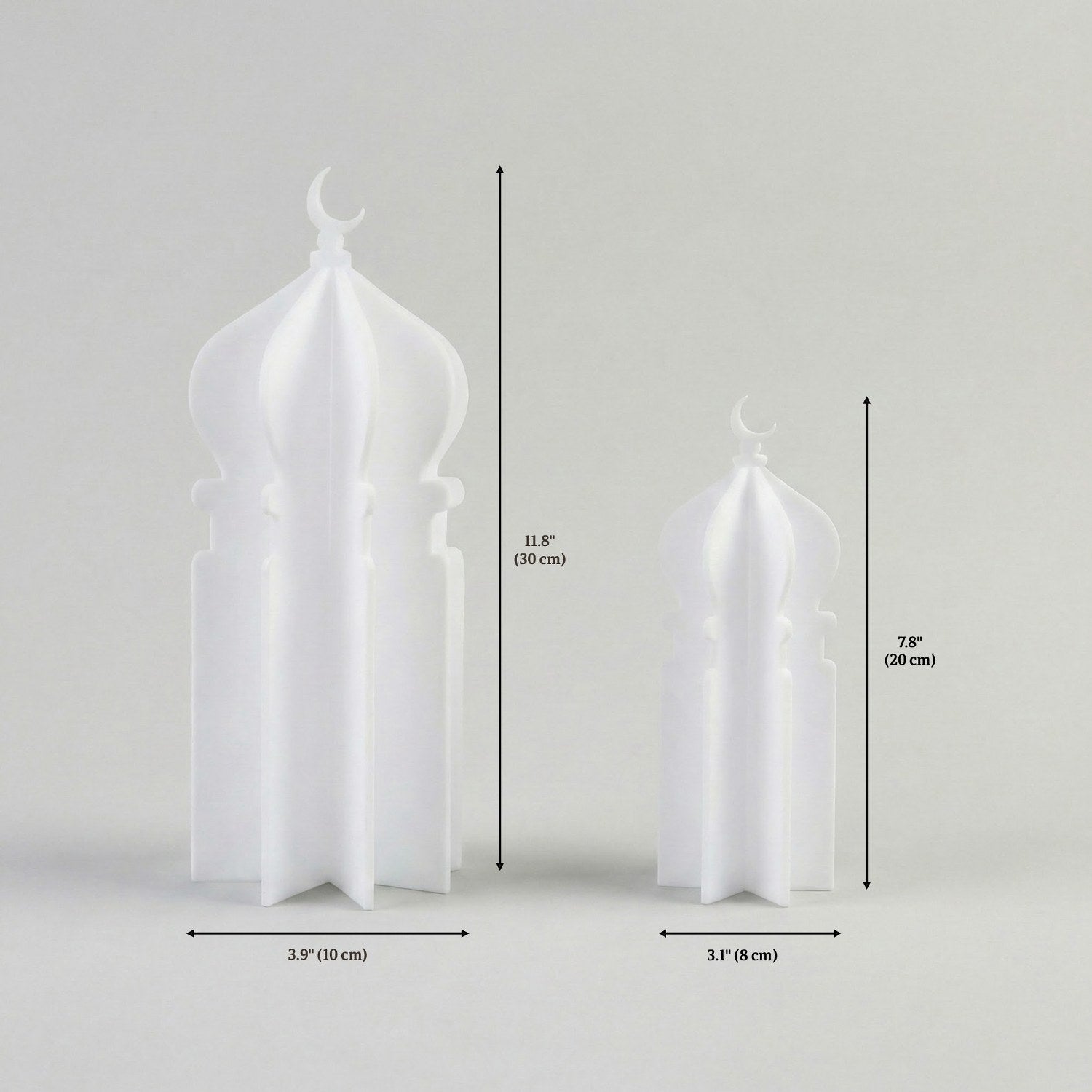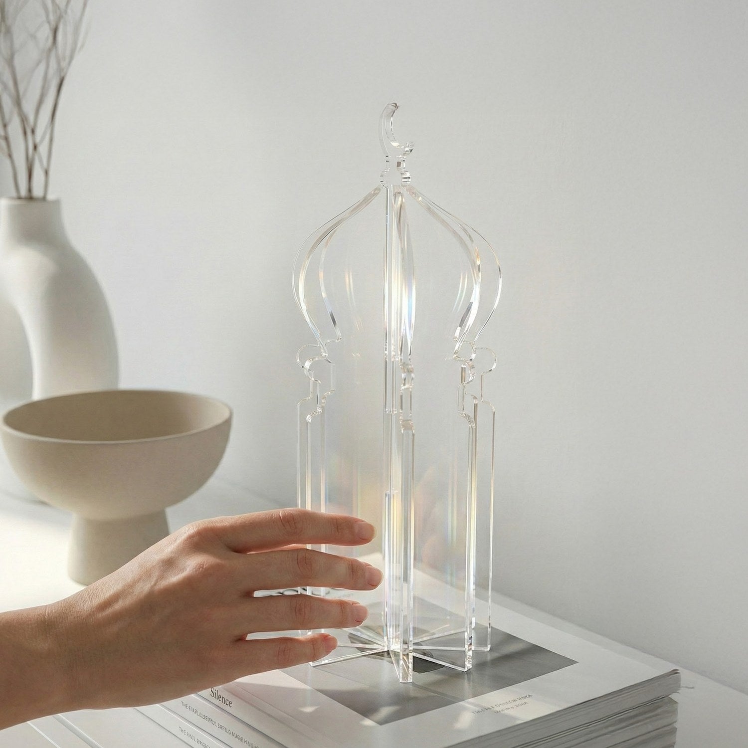 Ramazan masa üstü dekor anlayışına yepyeni bir soluk getiren özel tasarım; geleneksel motiflerin en modern haliyle tanışmanızı sağlıyor. Ramazan atmosferini evinizin her köşesinde hissettirecek akrilik aksesuar, minimalist hatlarıyla dekorasyonunuzu kusursuzca tamamlıyor. Geçmeli yapısı sayesinde üç boyutlu bir sanat eserine dönüşen minare figürü, hem masalarınızda hem de raflarınızda zarif bir odak noktası olacak.