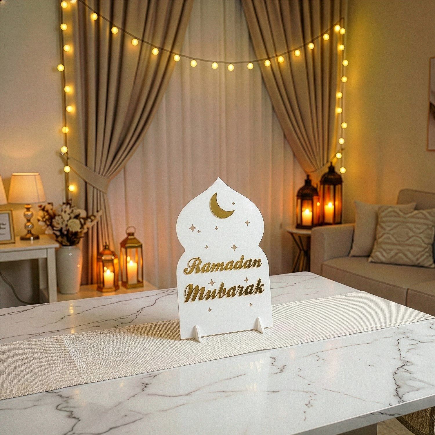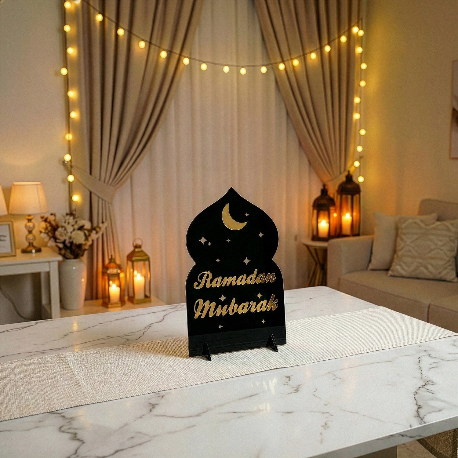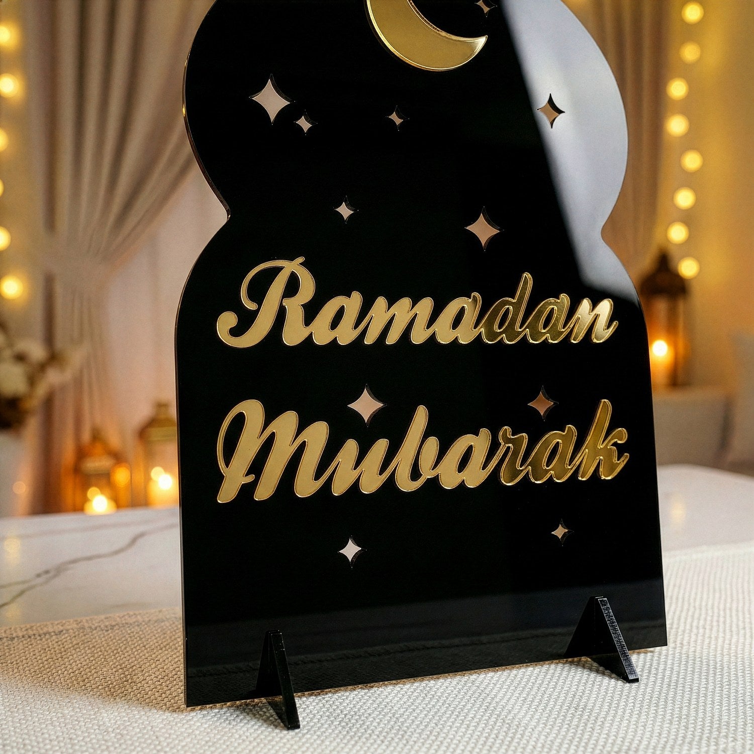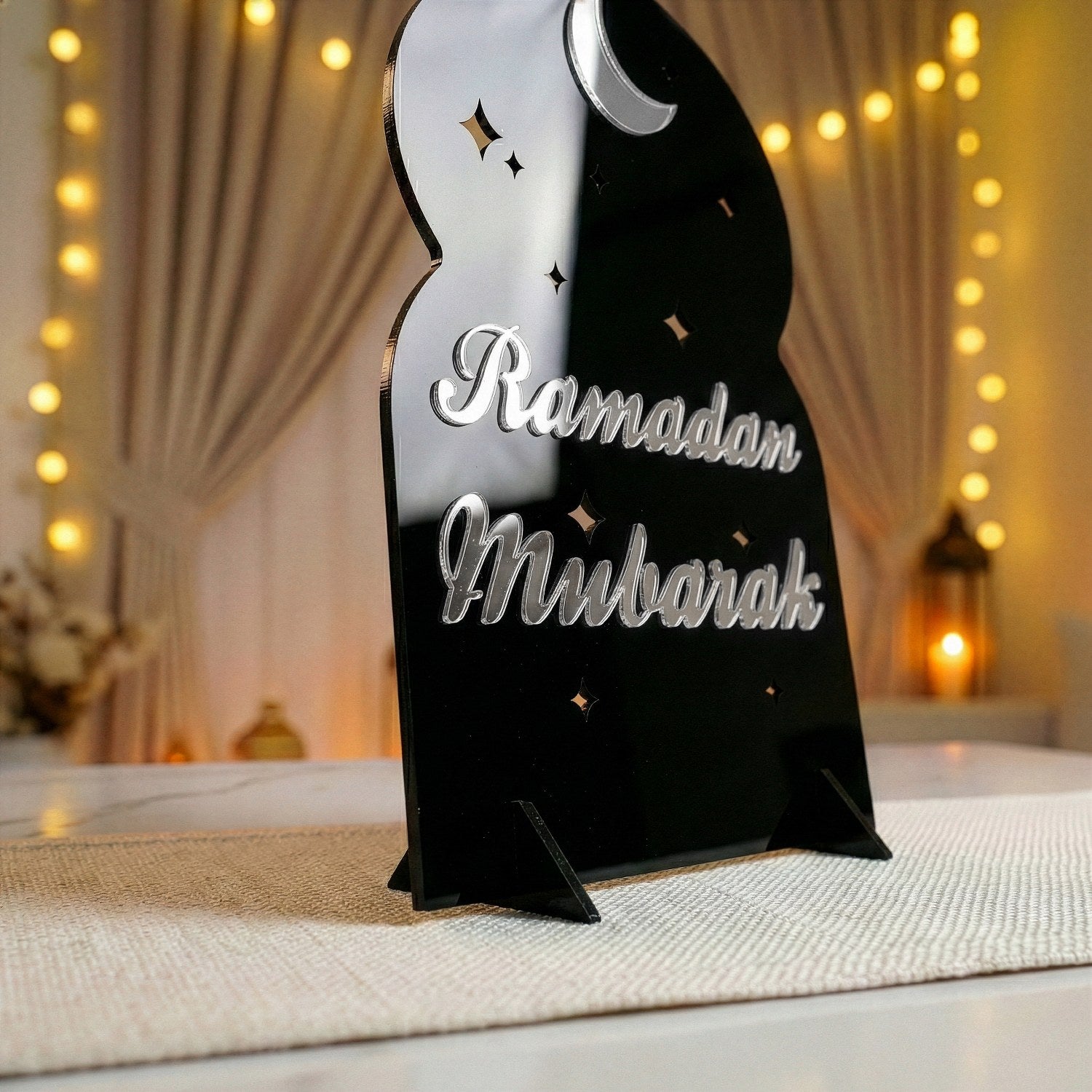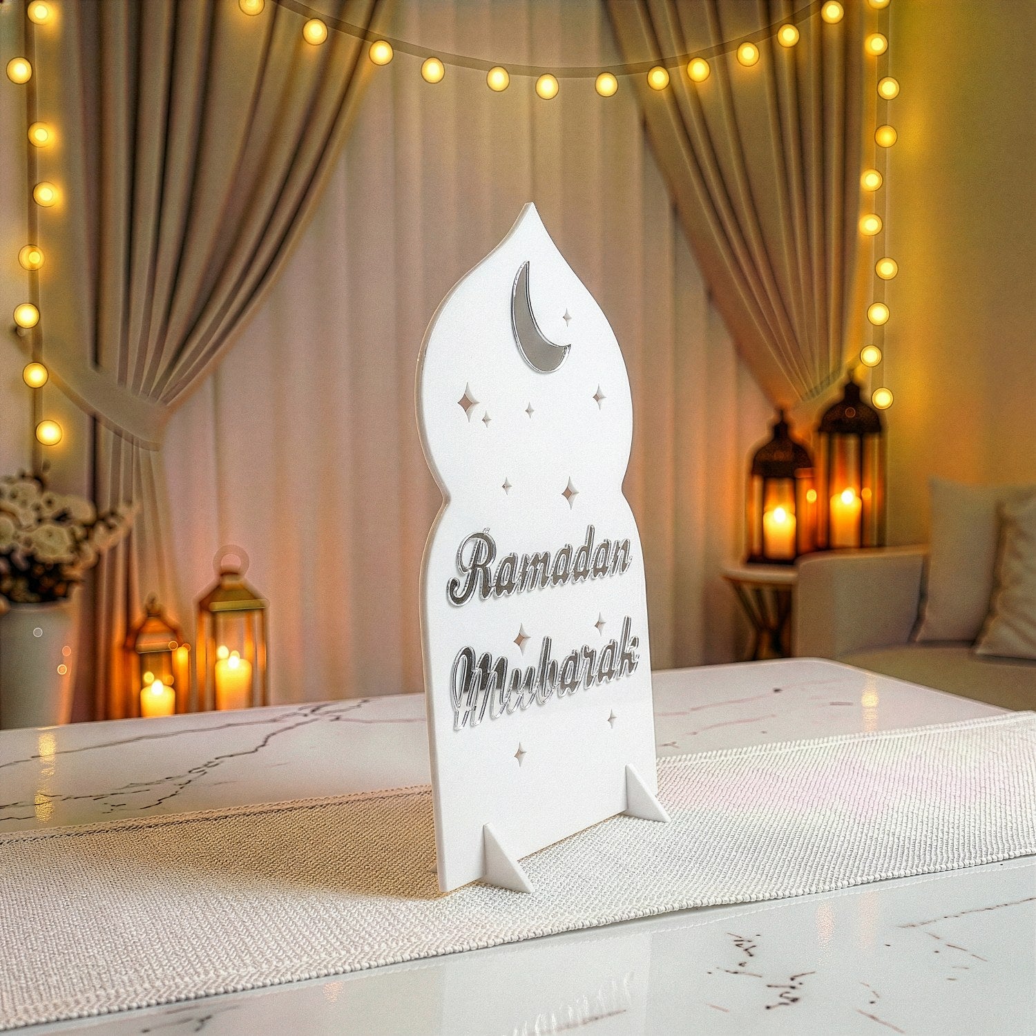 Ramazan mübarek akrilik masa üstü dekor ile modern bir Ramazan ayının manevi atmosferini çağdaş tasarımla buluşturun. Akrilik stand, ışığı yansıtan pleksi detaylarıyla evinizin her köşesinde aydınlık yayar. Yıldızlar ve Ramazan gecelerini simgeleyen hilal figürü ile tasarlanmış olan masa üstü dekor, ramazan sofralarınıza eşsiz bir dokunuş ekler. 4 farklı renk kombinasyonuyla modern çizgilerde tasarlanmış olup, her mekâna uyum sağlar.