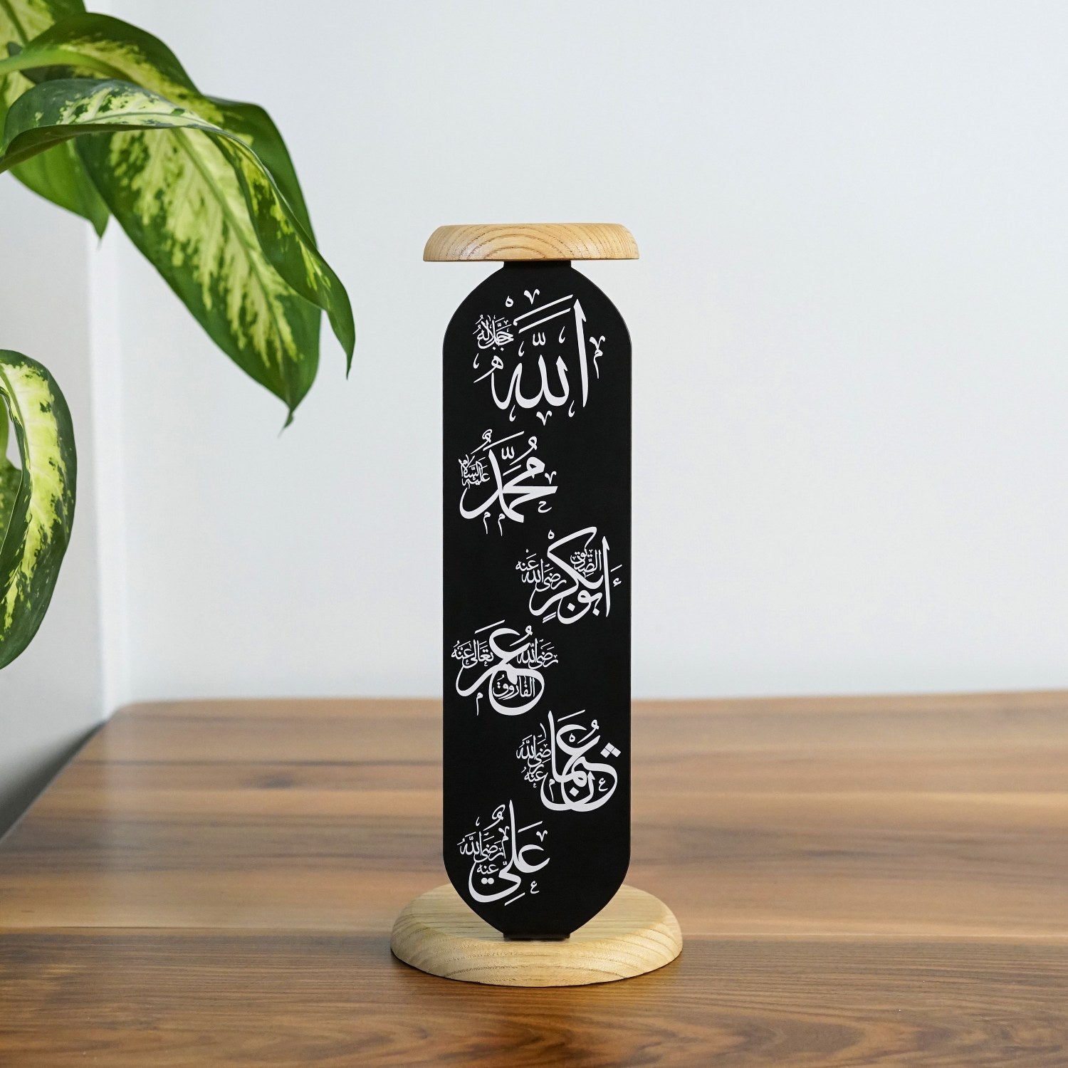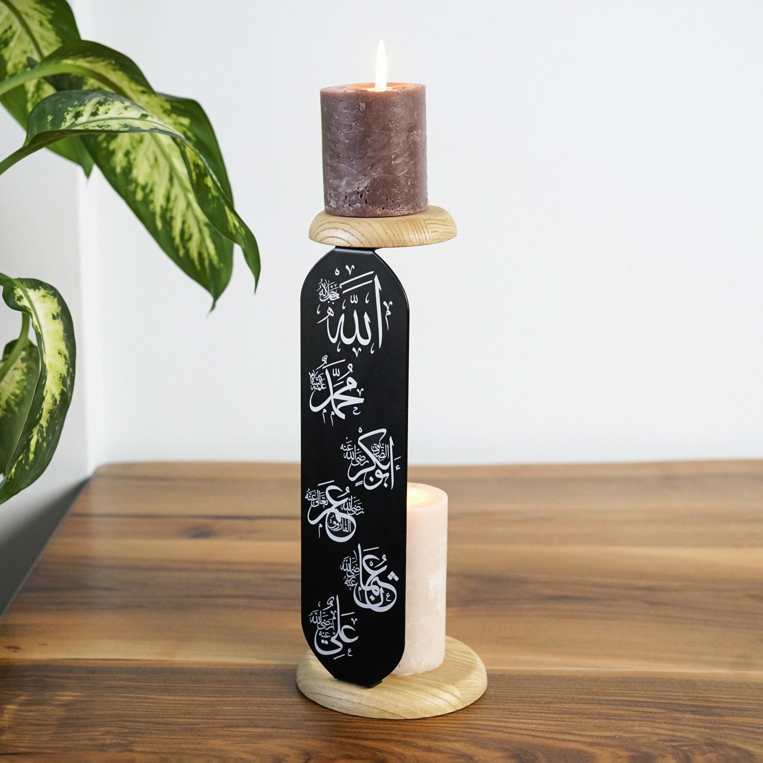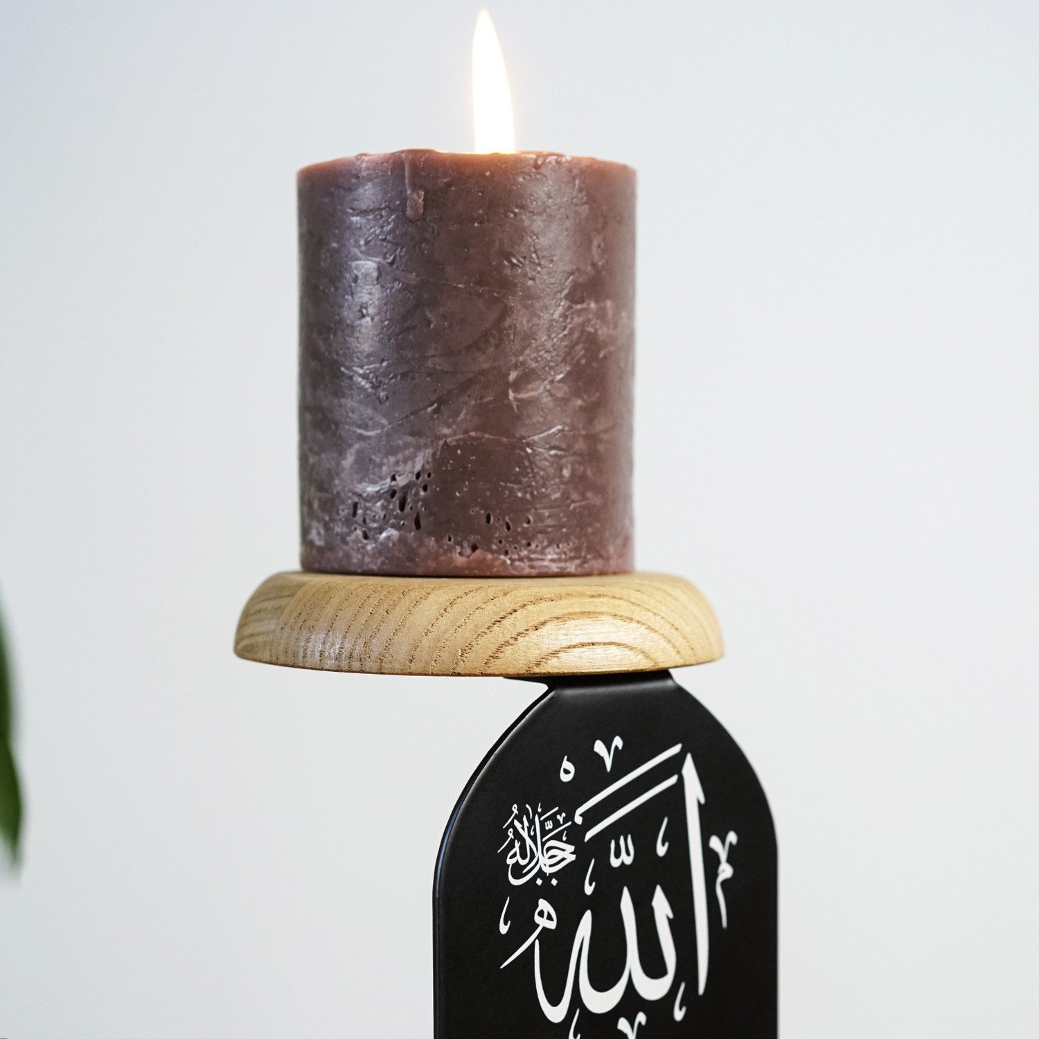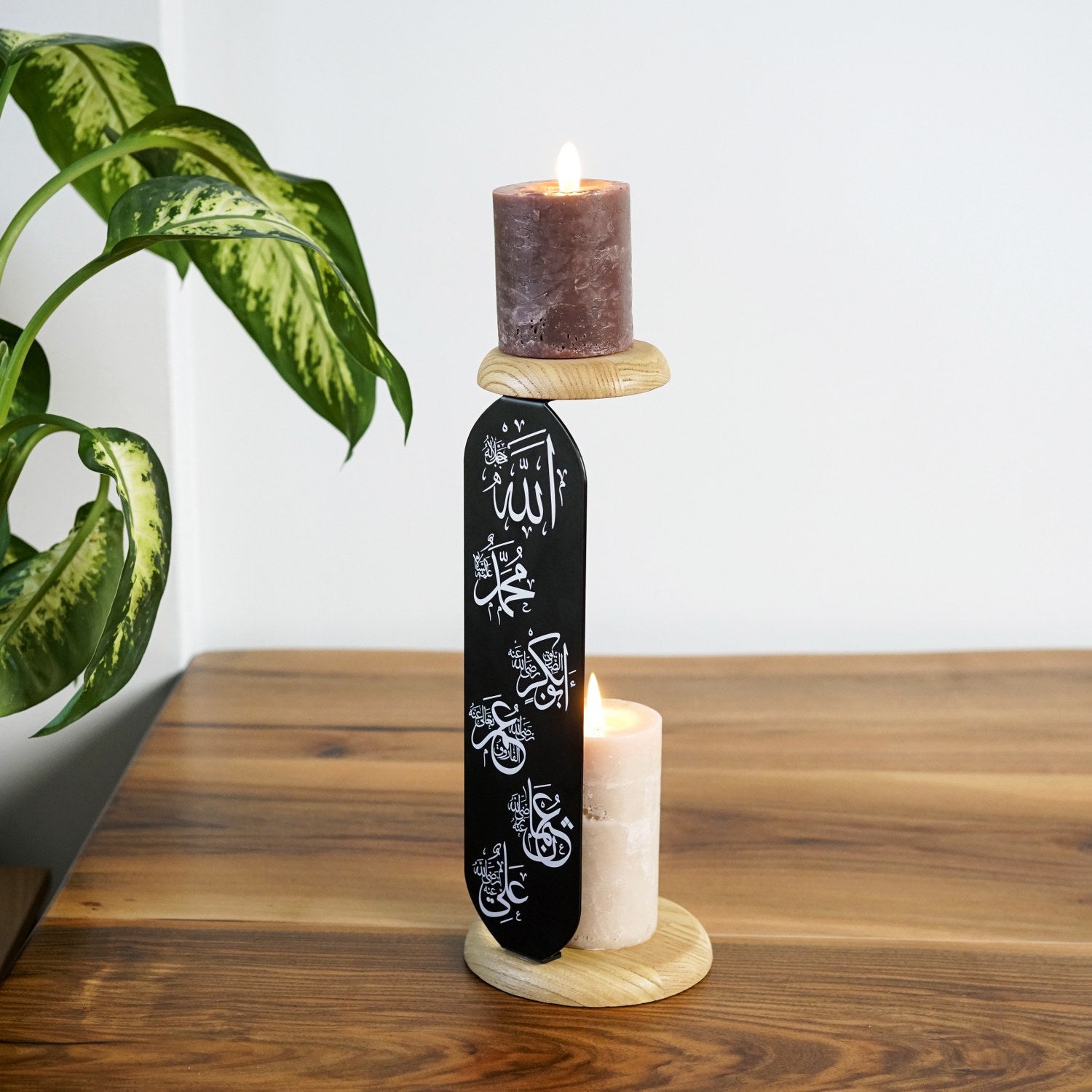 Allah ve Muhammed lafızlarının yer aldığı metal İslami mumluk üzerinde ayrıca hulefa-i raşidin yani dört halifenin isimleri (Hz Ebubekir, Hz. Ömer, Hz. Osman ve Hz. Ali) bulunmaktadır. Metal yüzeyine uygulanan yüksek kaliteli UV baskı ile her lafız net ve uzun ömürlü bir şekilde işlenmiştir. İki ahşap mum standı bulunan bu şık tasarım, modern bir dekorasyon ile dini bir derinlik sunar. Hem estetik hem de manevi anlam taşıyan İslami mumluk, evinizde veya ofisinizde kullanabileceğiniz zarif bir parçadır. Ayrıca sevdiklerinize özel ve anlamlı bir hediye olarak da tercih edebilirsiniz.