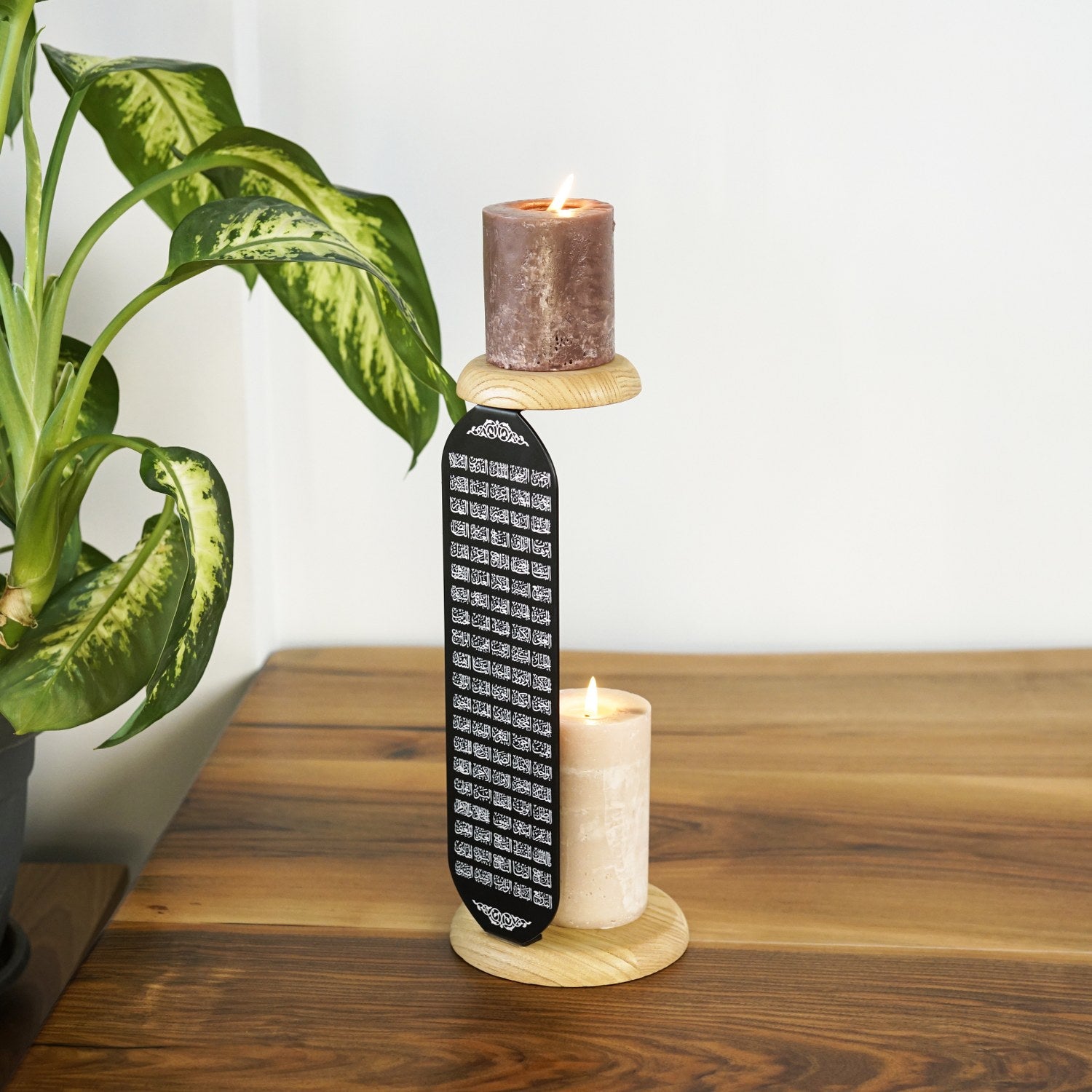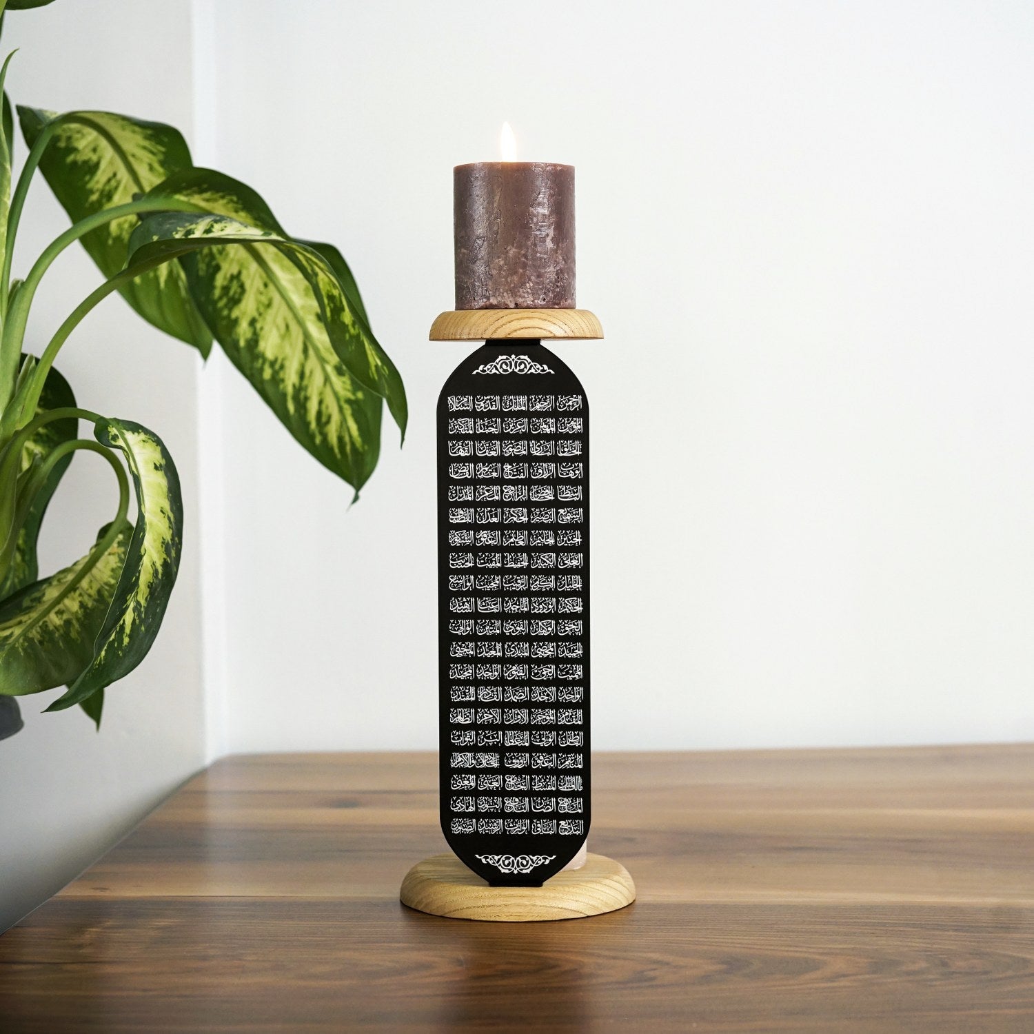 siyah metal uzerine beyaz uv ile esmaul husna yazili alt ve ust kisminda bulunan ahsap mum standi ile dekoratif bir urundur islamicwallarttr