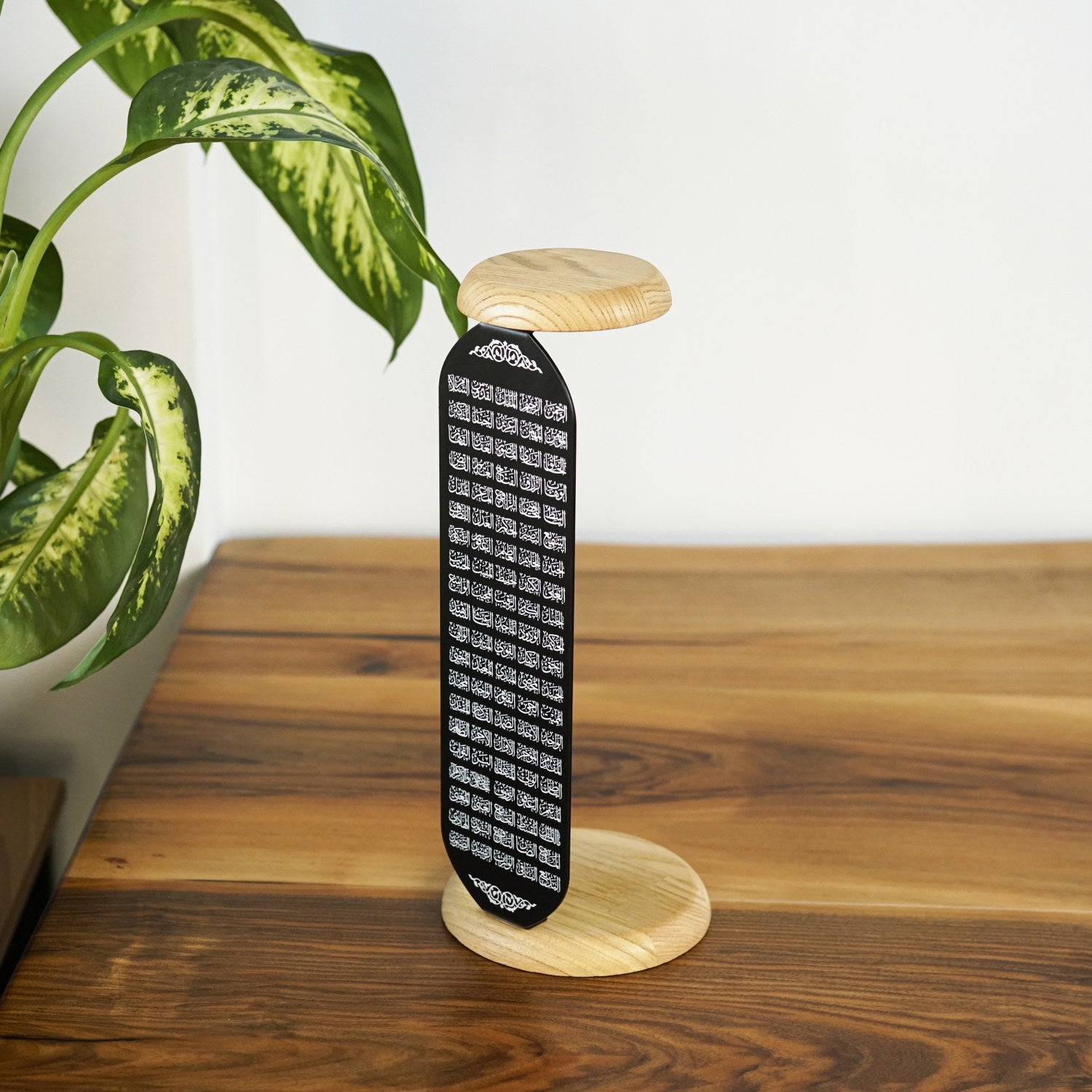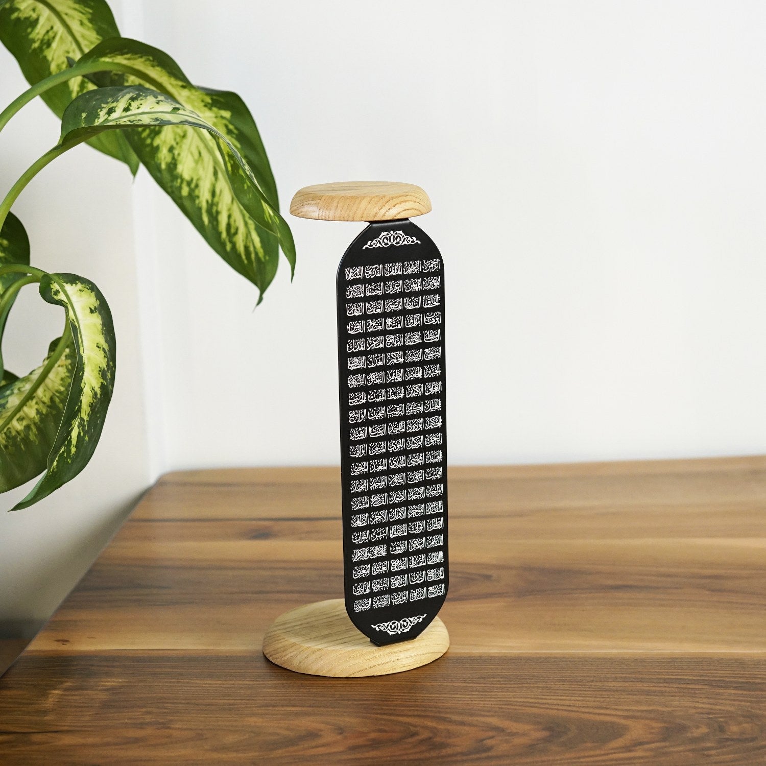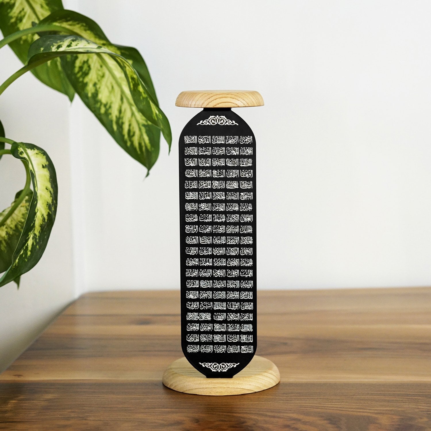 siyah metal uzerine uv baski ile esmaul husna yazili altta ve ustte ahsap standi olan mumluk islamicwallarttr