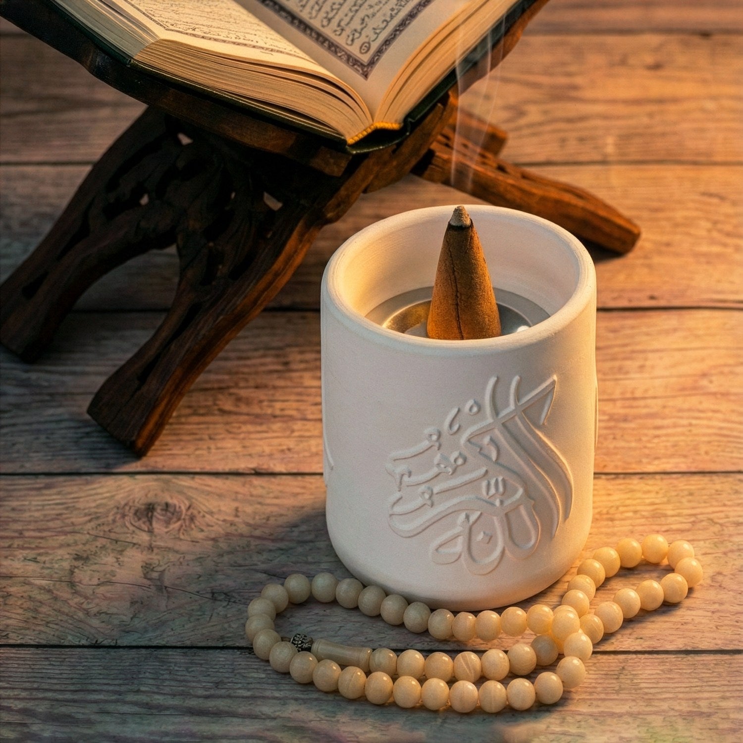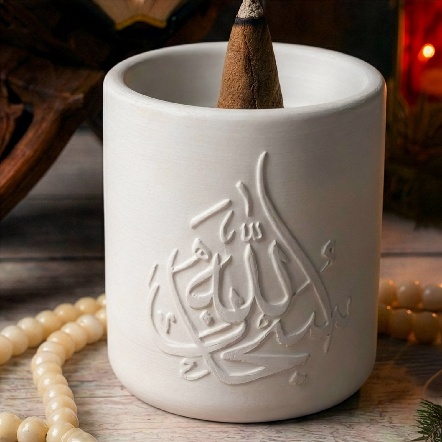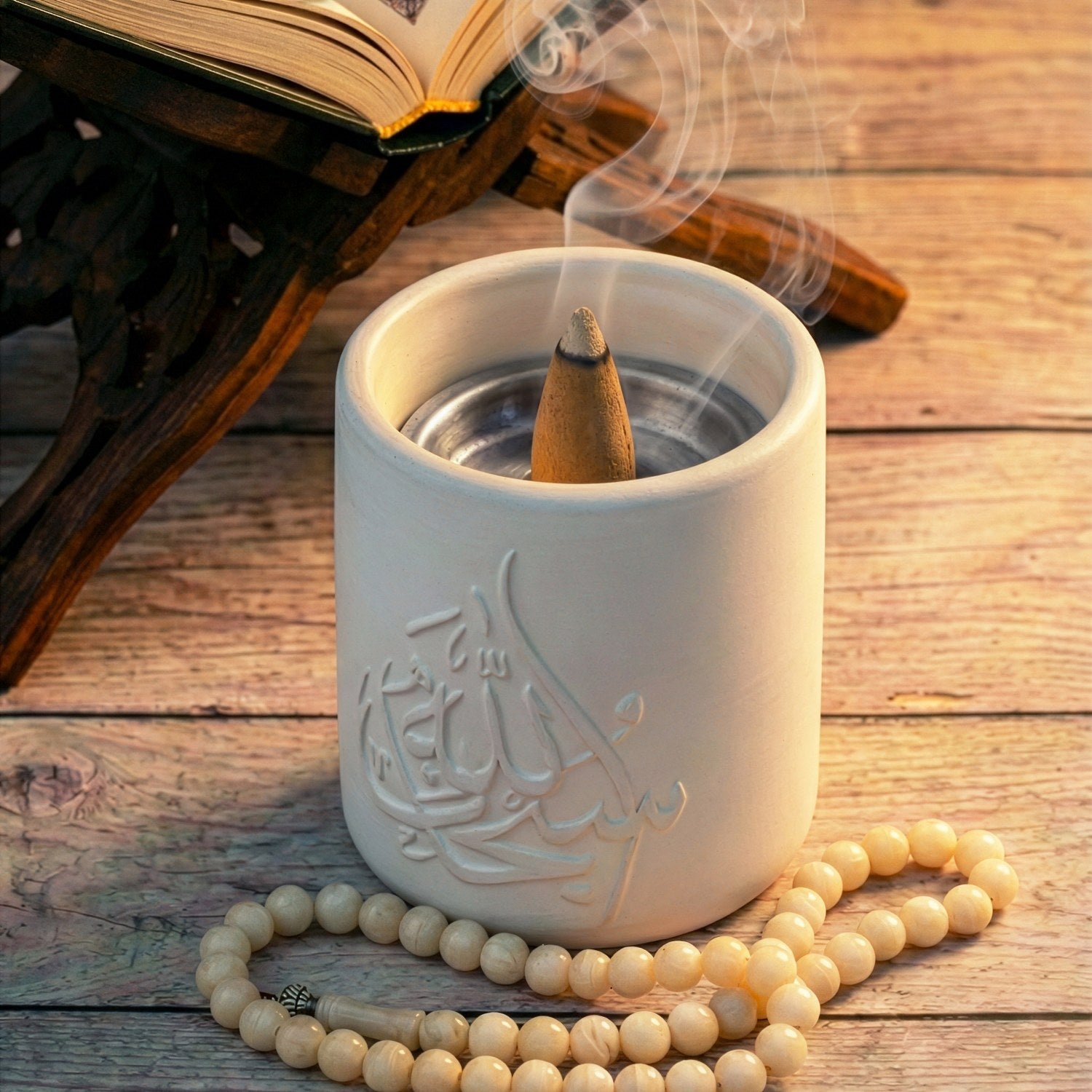 Allah ve Muhammed lafızlı el yapımı taş buhurdanlık, hat sanatının zarif çizgilerinden ilham alınarak tasarlanmış özel bir dekoratif objedir. Üzerinde yer alan “Allah” ve “Muhammed” lafızları, manevi bir atmosfer oluştururken sade ve güçlü stiliyle bulunduğu ortama huzur katar.
