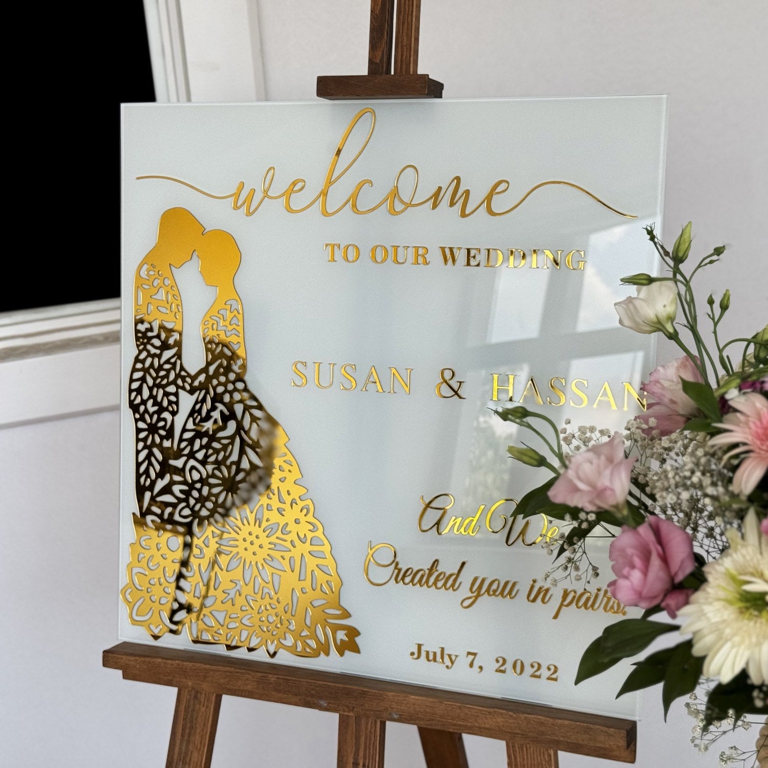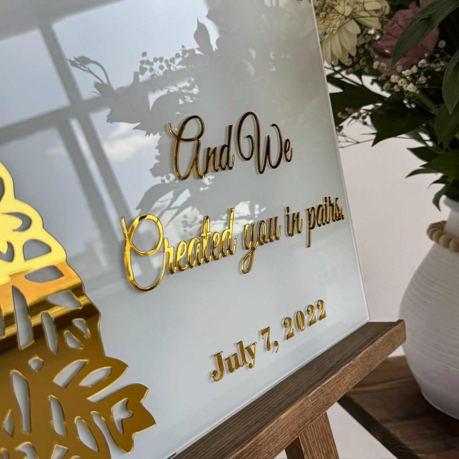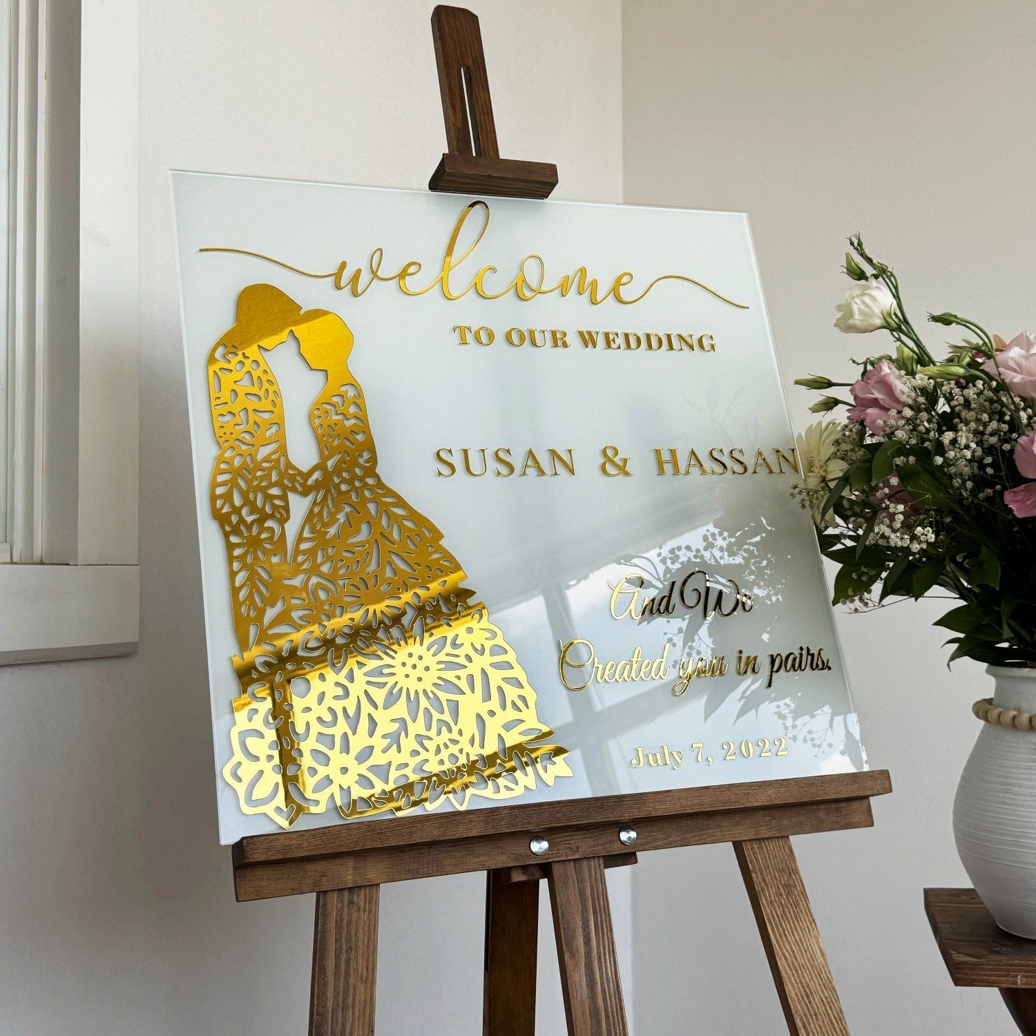 Karşılama panosu, düğün ve özel günlerinizde misafirlerinize anlamlı ve zarif bir başlangıç sunmanın en özel yoludur. Bu kişiselleştirilebilir cam panoda yer alan Nebe Suresi 8. ayet, evlilik birliğinin ve ortak yaşamın güzelliklerini hatırlatır. Altın pleksi detaylı temperli cam, hem estetik hem de uzun ömürlü bir tasarım sunar. Bu ürün, sıradan bir dekoratif objeden öte, inancın ve sevginin bir yansıması olarak özenle hazırlanmıştır. Düğününüze veya özel etkinliğinize manevi bir anlam katmak için ideal bir tercihtir.