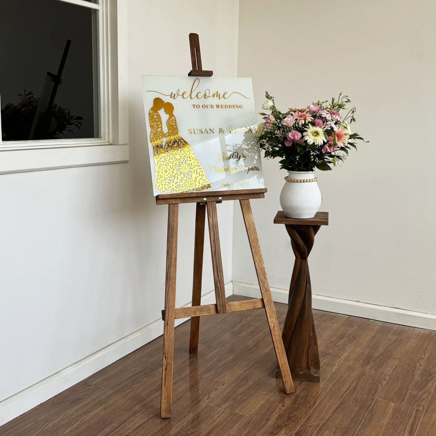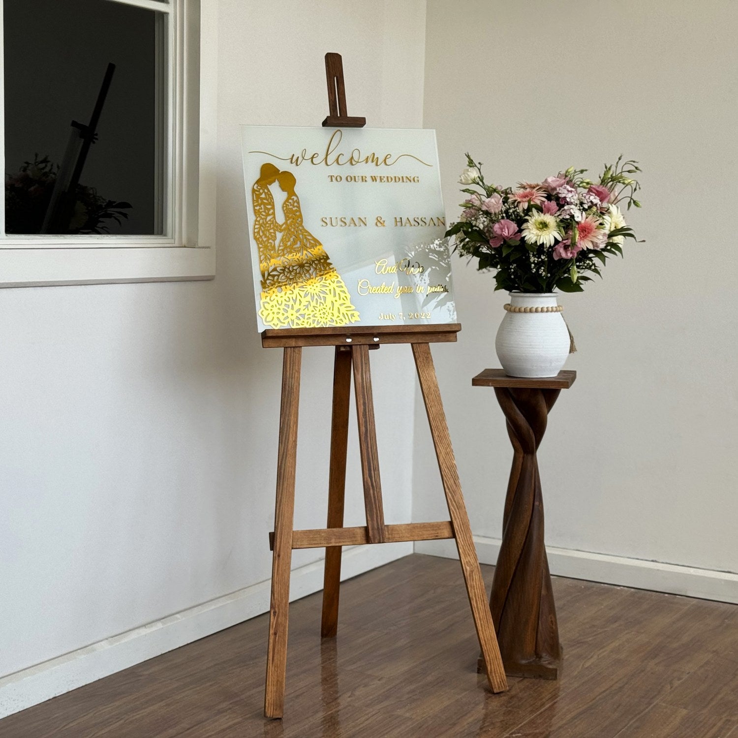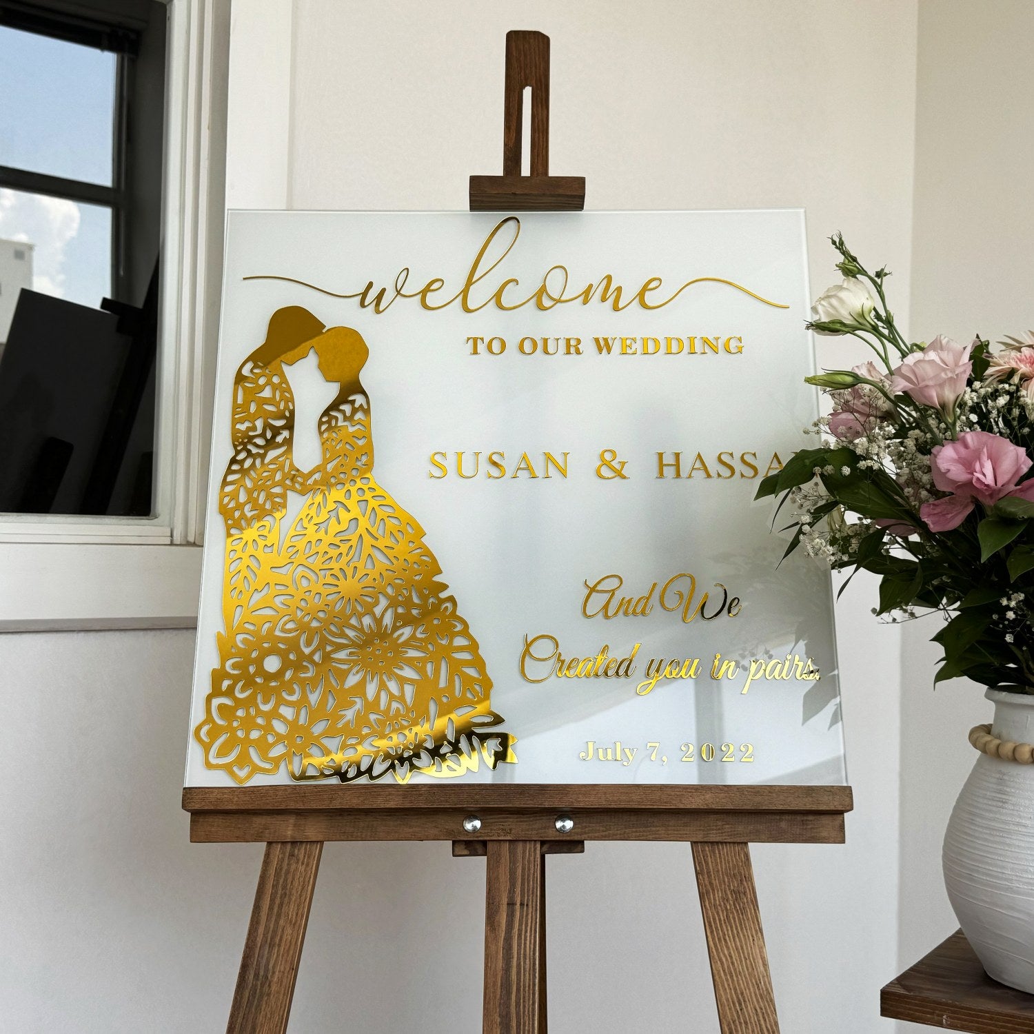 Karşılama panosu, düğün ve özel günlerinizde misafirlerinize anlamlı ve zarif bir başlangıç sunmanın en özel yoludur. Bu kişiselleştirilebilir cam panoda yer alan Nebe Suresi 8. ayet, evlilik birliğinin ve ortak yaşamın güzelliklerini hatırlatır. Altın pleksi detaylı temperli cam, hem estetik hem de uzun ömürlü bir tasarım sunar. Bu ürün, sıradan bir dekoratif objeden öte, inancın ve sevginin bir yansıması olarak özenle hazırlanmıştır. Düğününüze veya özel etkinliğinize manevi bir anlam katmak için ideal bir tercihtir.