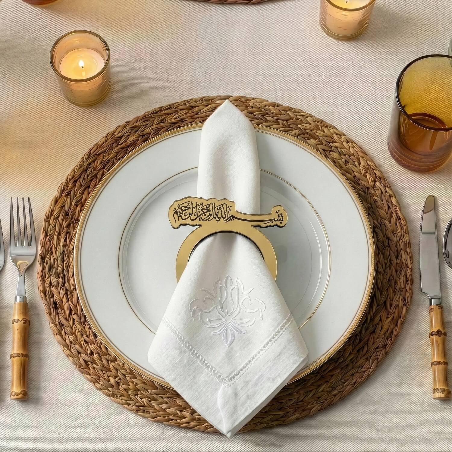 Akrilik peçete halkası ile Ramazan sofralarınıza estetik bir dokunuş katın. Üzerinde yer alan sülüs hat Besmele işlemesi ile manevi bir hatırlatıcı görevi görürken, kristal parlaklığındaki şık tasarımı ile de göz kamaştırır. Hem fonksiyonel hem de dekoratif bir aksesuar olan akrilik yüzük iftar sofralarınıza çok yakışacak.