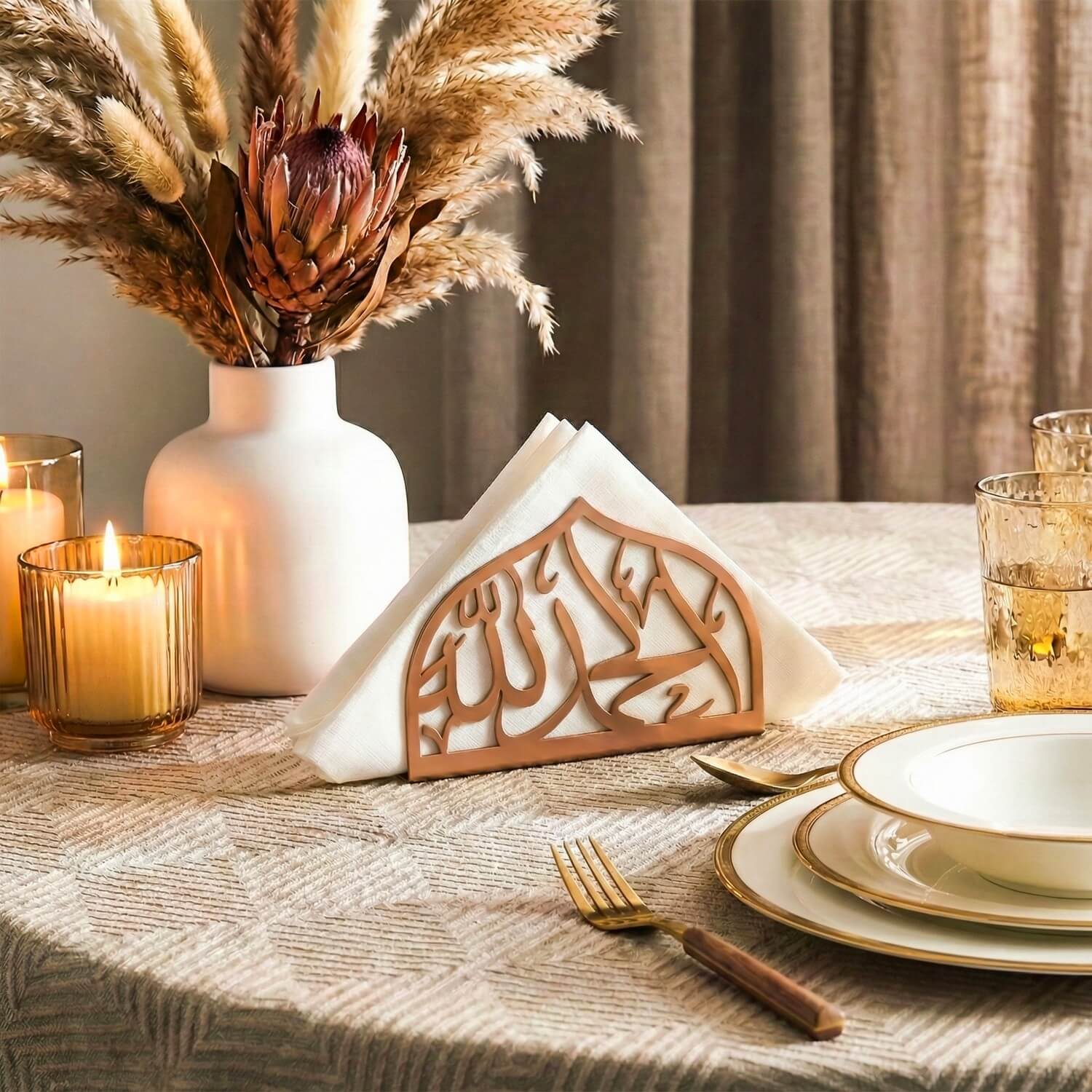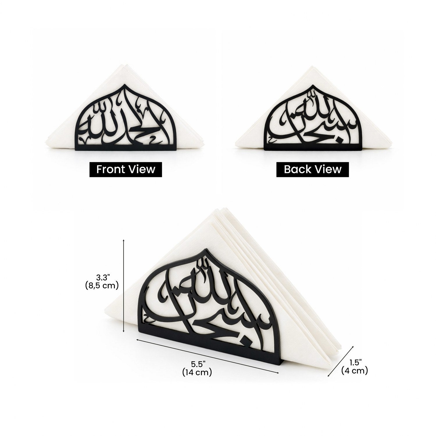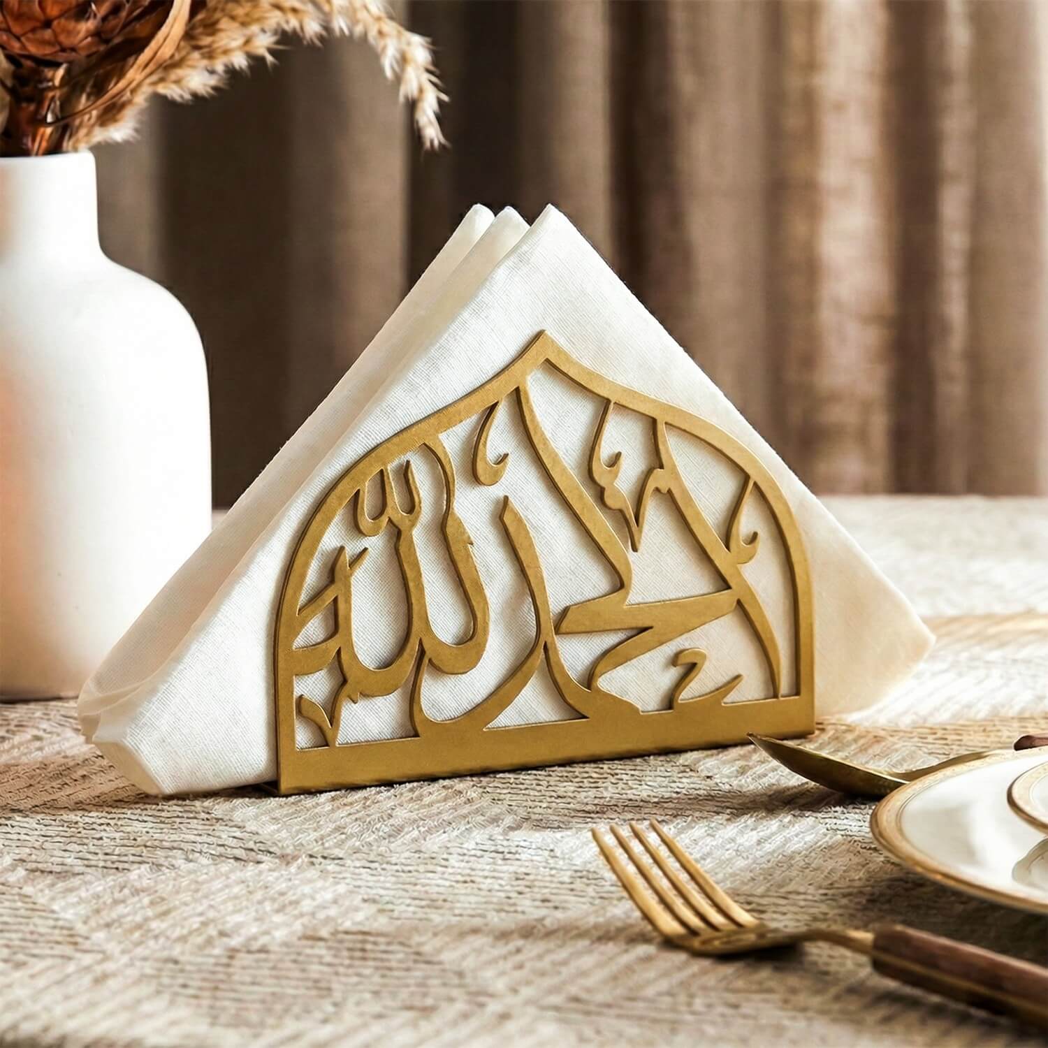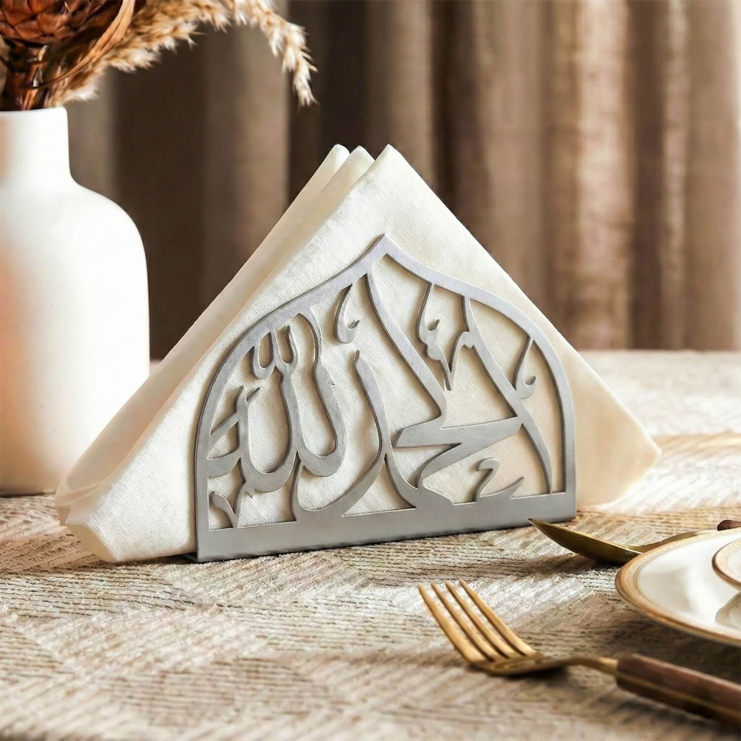 Bismillah ve elhamdülillah yazılı metal peçetelik, estetik bir hatırlatıcı görevi görür. Bir yönünde yazan "Bismillah" yemeğe Allah'ın adıyla başlamayı, diğer yönünde yazan "Elhamdülillah" ise şükrümüzü eda etmeyi işaret eder. Bu anlamlı aksesuar ile Ramazan ayının huzur ve bereketini sofralarınıza taşıyabilir, masalarınıza şık bir dokunuş katabilirsiniz.