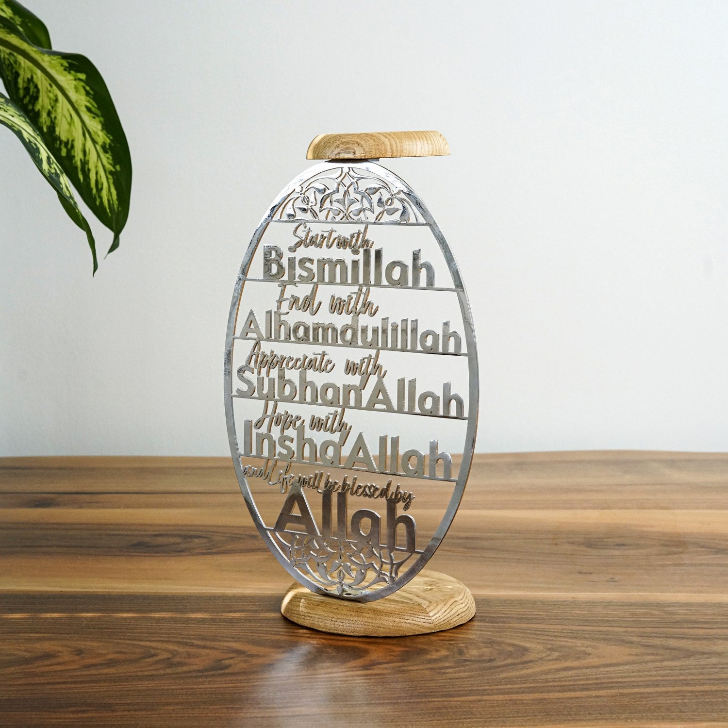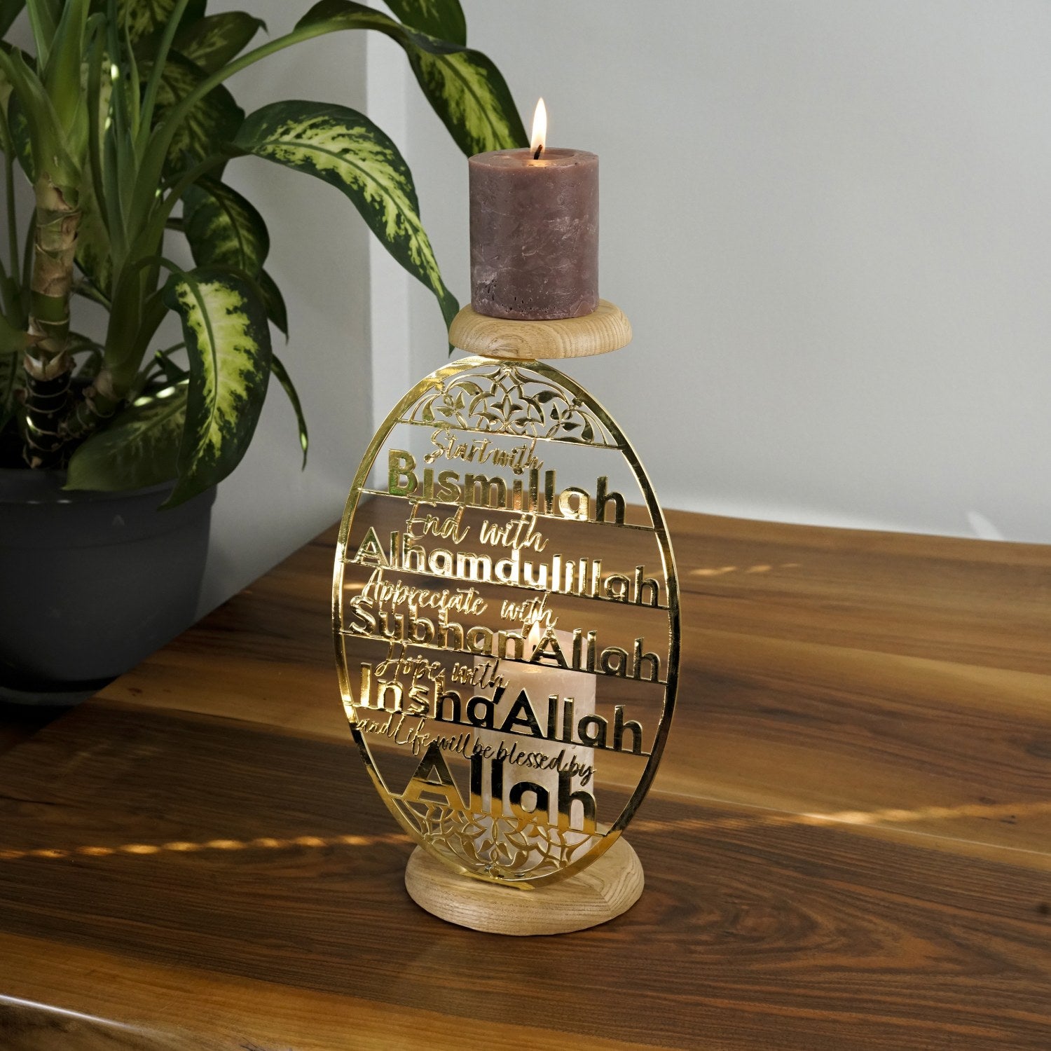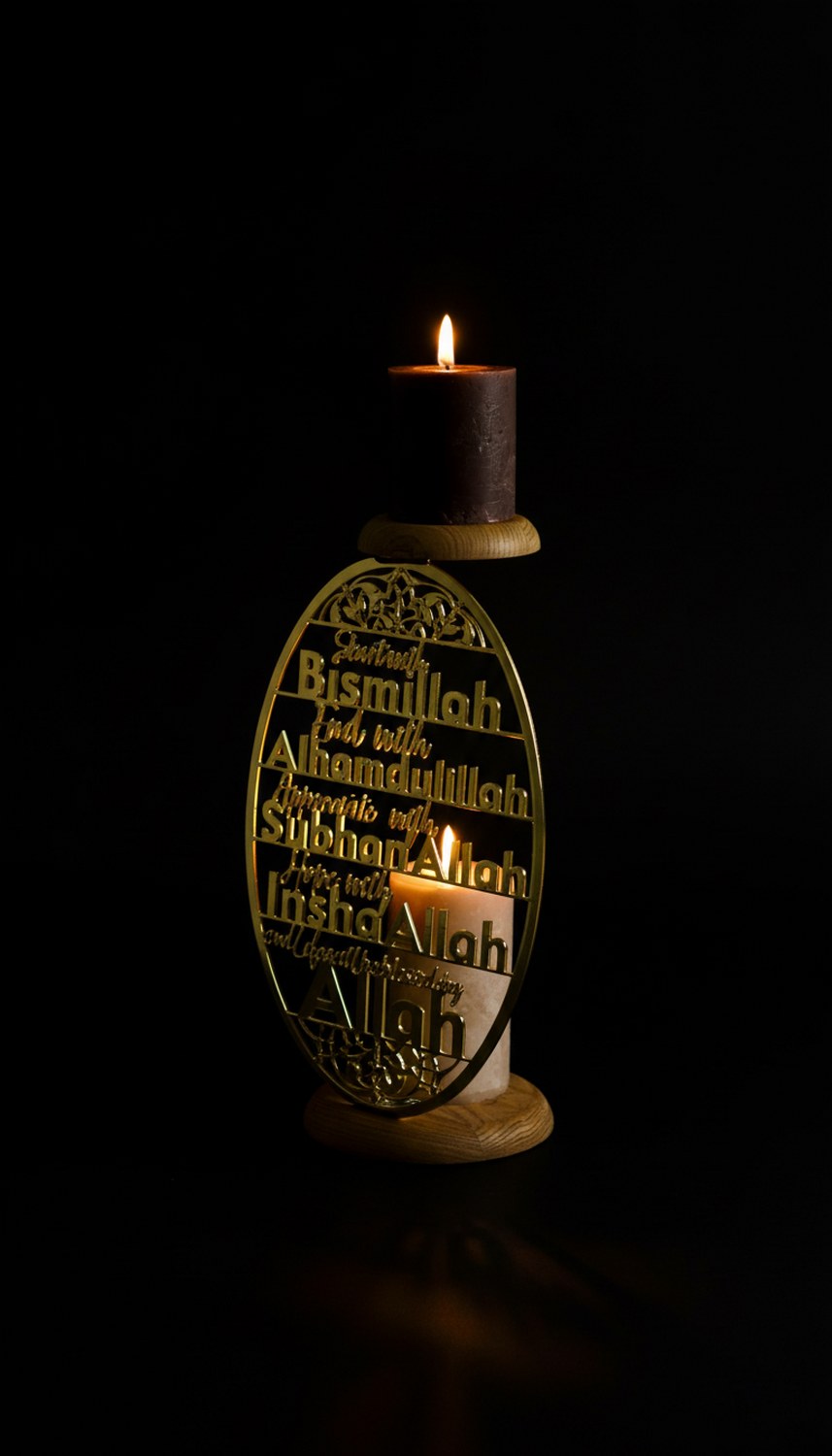 Bismillah, elhamdülillah, sübhanallah ve inşallah yazılı metal mumluk dekorasyonunuza anlamlı ve zarif bir katkı sağlar. "Bismillah ile başla", "Elhamdülillah ile bitir", "Sübhanallah ile takdir et" ve "İnşallah ile ümit et" ifadeleri, İngilizce yazılmış olup, Allah'ın nimetlerini anlamlı bir şekilde hatırlatır. Estetik ve modern bir yaklaşımla tasarlanan bu ürün evinize huzur ve sükunet katar. Ramazan hediyesi olarak veya bereketli sofralar için mükemmel bir seçenektir.
