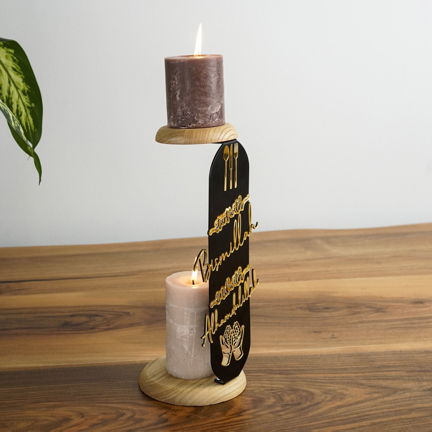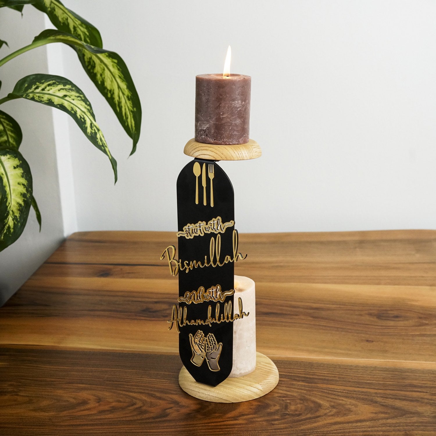 alt ve ust ahsap tablasinda yanan mumlar bulunan siyah metal kisminda altin pleksi ile bismillah ve elhamdulillah yazan mumlugun yan acidan gorunumu islamicwallarttr