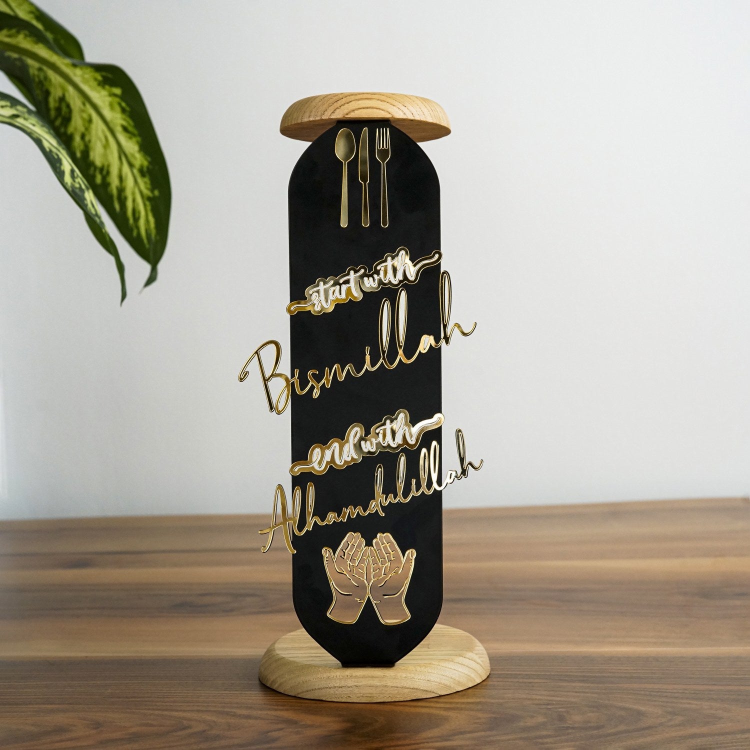 yan acidan gorunen mumluk siyah metal ile ahsap iki tabladan olusuyor ve uzerinde altin pleksi ile bismillah ile basla elhamdulillah ile bitir yaziyor islamicwallart