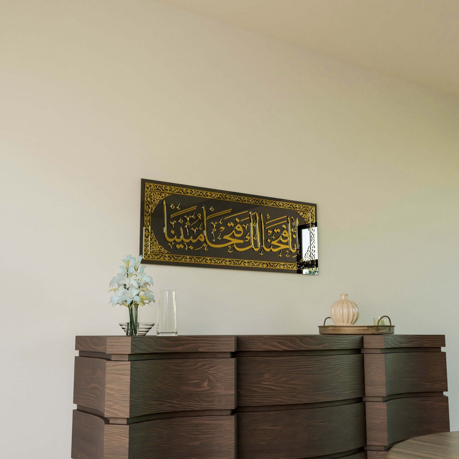 Fetih Suresi cam tablo, dini tablolar içerisinde özel bir yere sahiptir. Fetih suresinin 1. ayetini içeren bu anlamlı eser, ilahi yardımı ve zaferi temsil eder. Bu anlamı, İslam sanatının estetiği ve cam zarafetiyle buluşturup İslamic Wall Art kalitesiyle size sunmaktan mutluluk duyuyoruz.