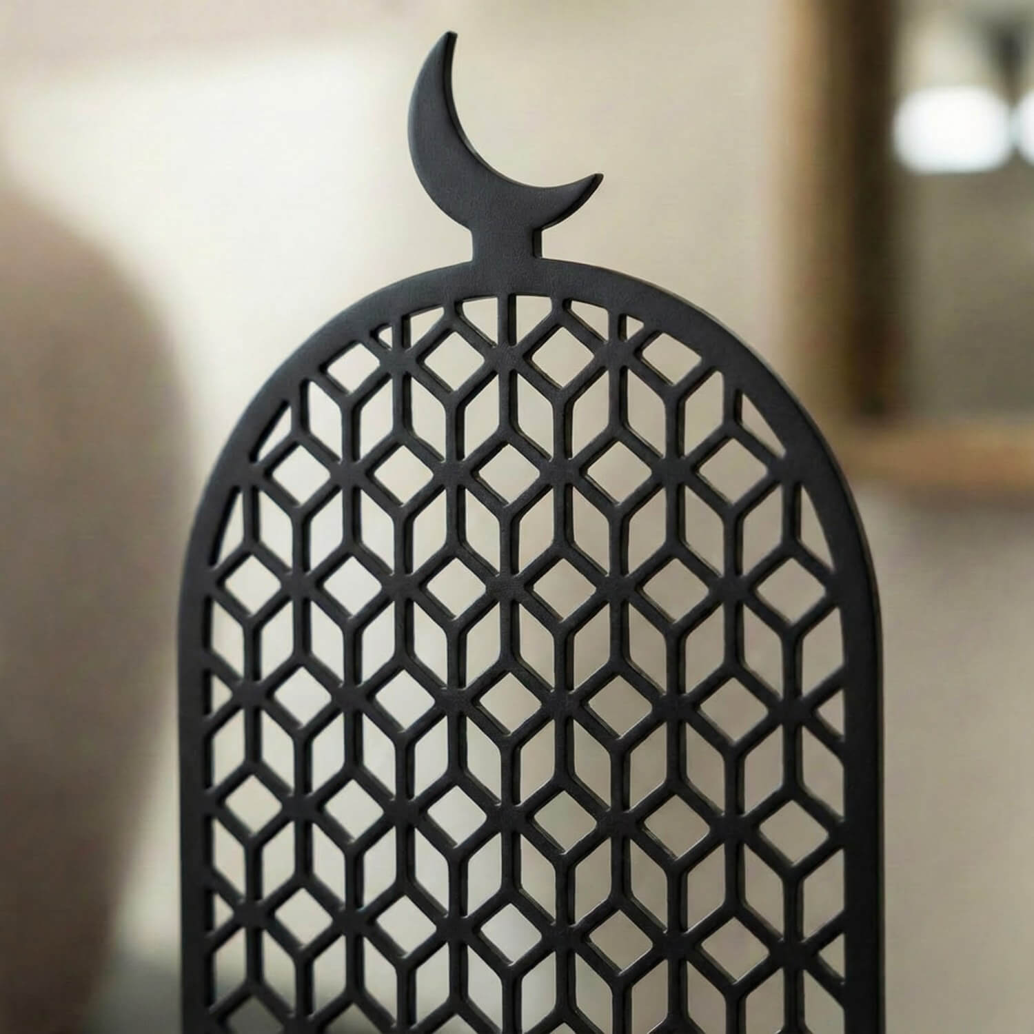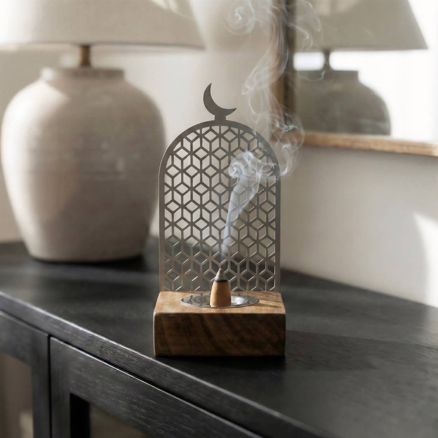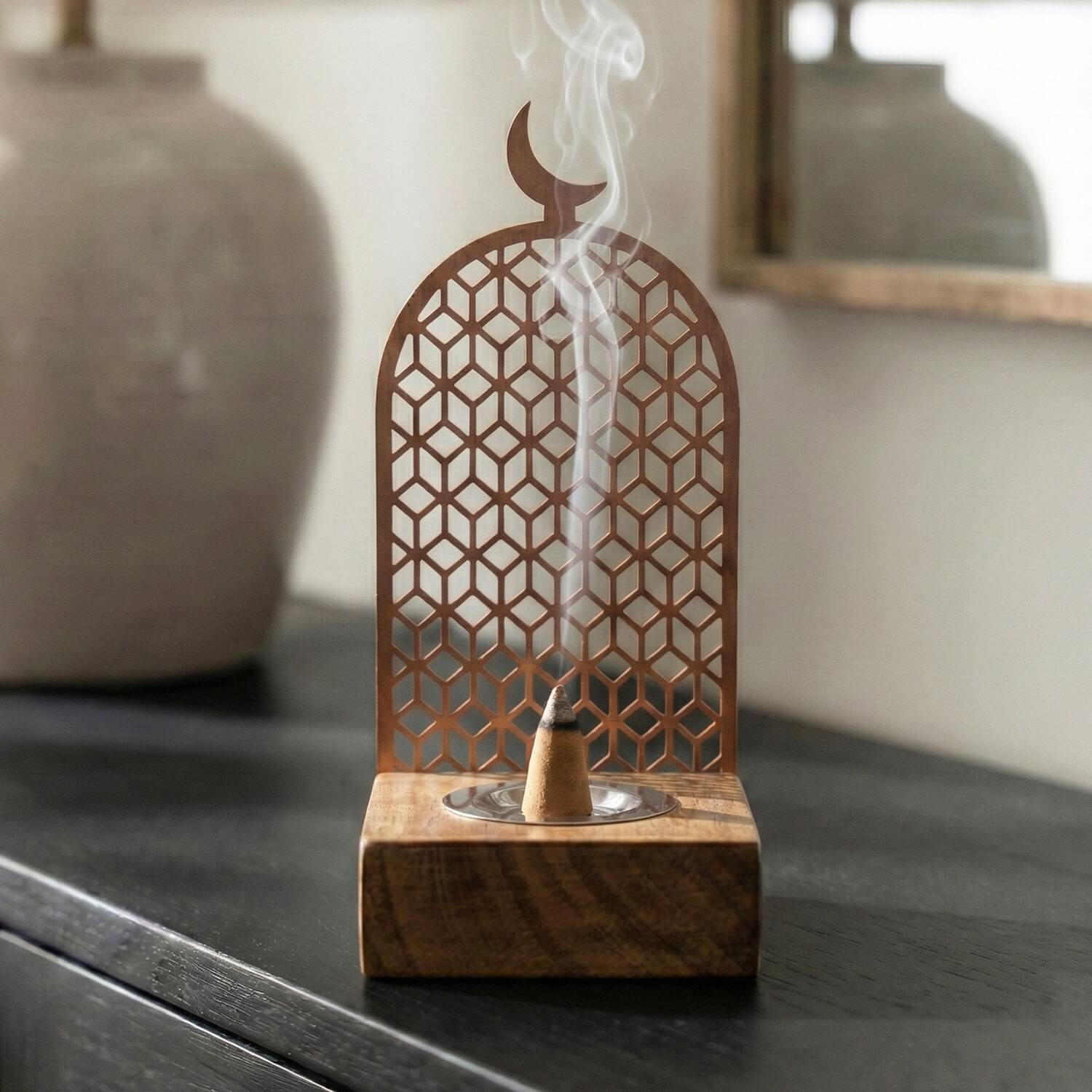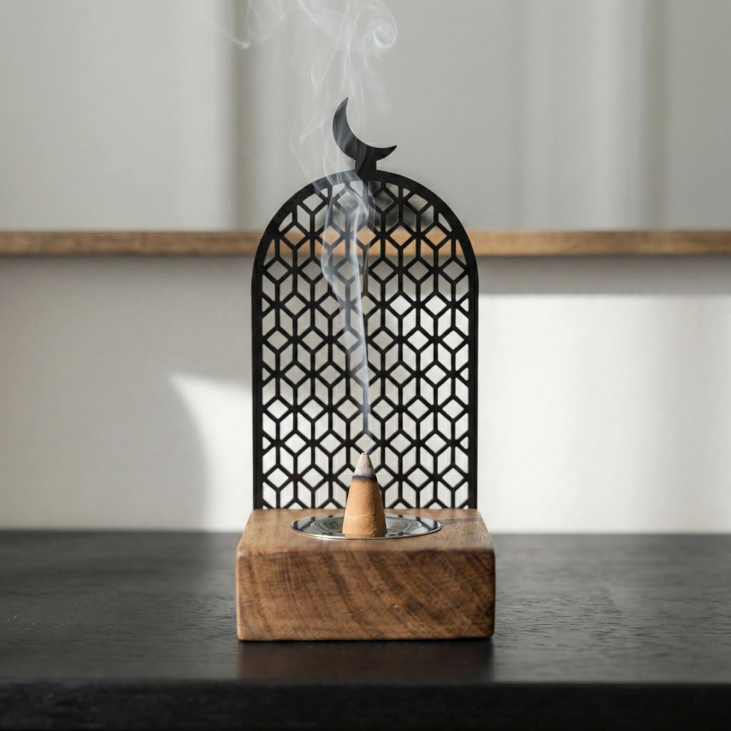 Geometrik motifli mihrap tasarım tütsülük, ev dekorasyonunuza şıklık ve anlam katıyor. Mihrap formunda tasarlanmış metal tütsülüğümüz, modern geometrik motiflerle işlenmiş detaylarıyla, hem estetik hem de fonksiyonel bir kullanım sunuyor. Ahşap standı, doğal dokusu ile tütsülüğün modern yapısıyla uyum içinde, evinizin her köşesine şıklık katmak için mükemmel bir tercihtir.