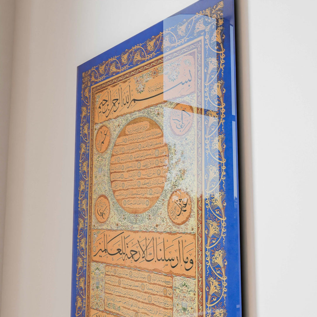 Hilye-i şerif cam tablomuz, UV baskı teknolojisi ile temperli cam üzerine yüksek kalitede işlenmiştir. Cam yüzeyin sağladığı dayanıklılık ve berraklık, yazı sanatının her detayını ön plana çıkarırken, eserin uzun yıllar boyunca solmadan kalmasını sağlar.
