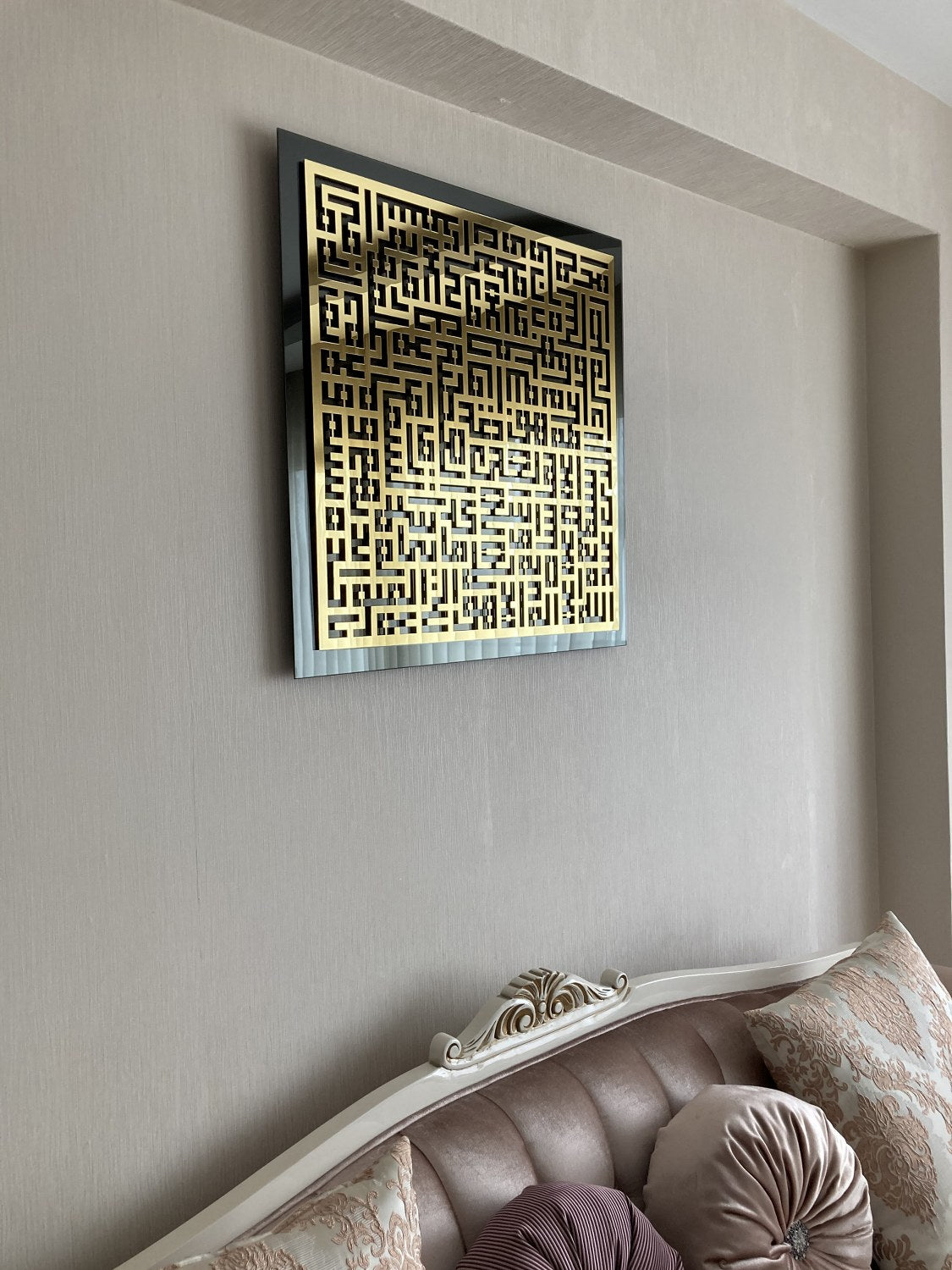 - Islamic Wall Art farkıyla cama sanatsal bir dokunuş yaptık; kırılmaya karşı normal camlara göre 10 kat daha dayanıklı temper işlemi görmüş 4 mm kalınlığında kenarları rodajlı birinci sınıf düz camlara, muhteşem hat eserlerini; 3 boyut görünüm kazandıran 3 mm kalınlığında MDF ahşaptan üretilmiş özel tasarım ürünlerimize, 1.2 mm kalınlığında altın veya gümüş renk akrilik malzeme eklenerek son derece şık ve parıltılı bir görünüm kazandırılmıştır.