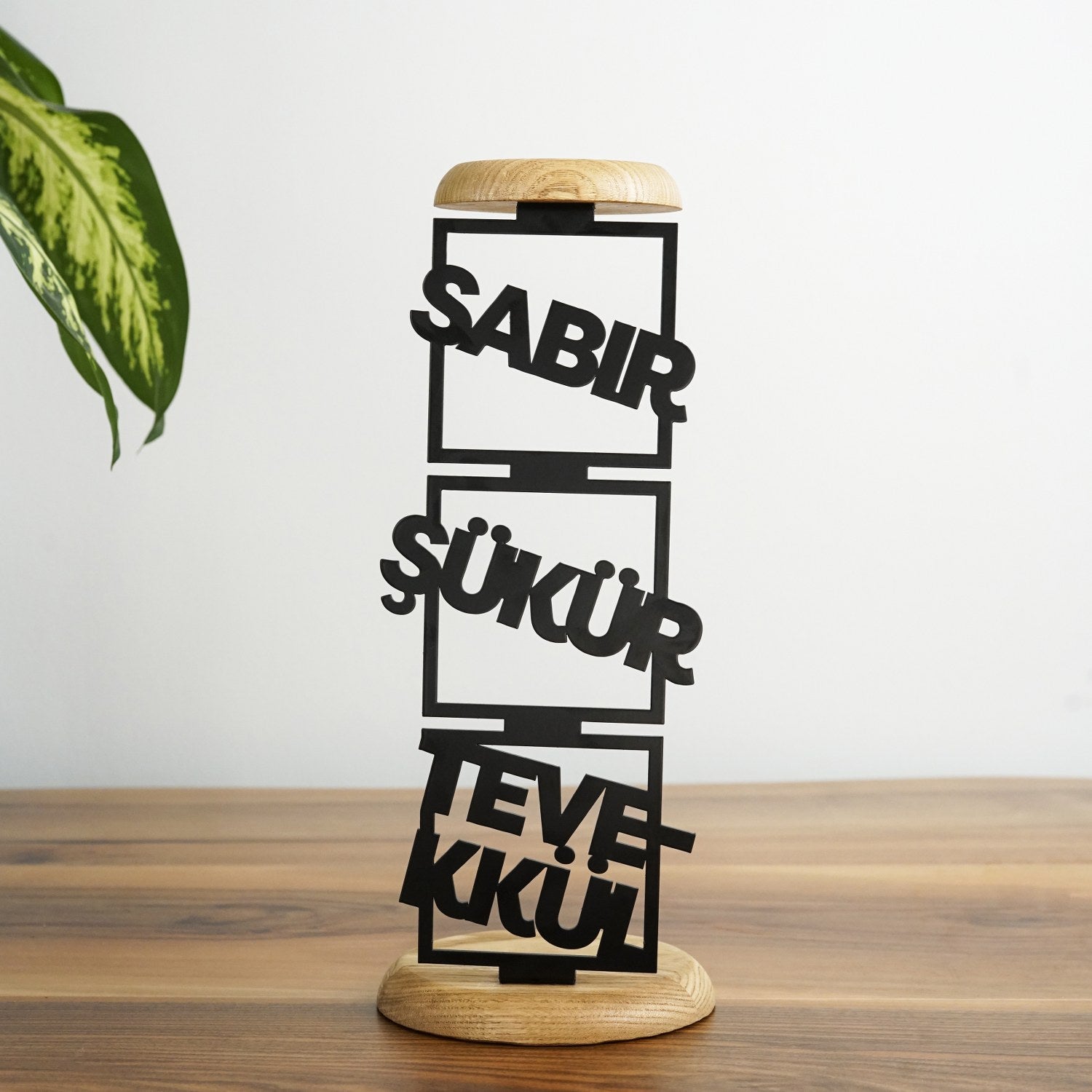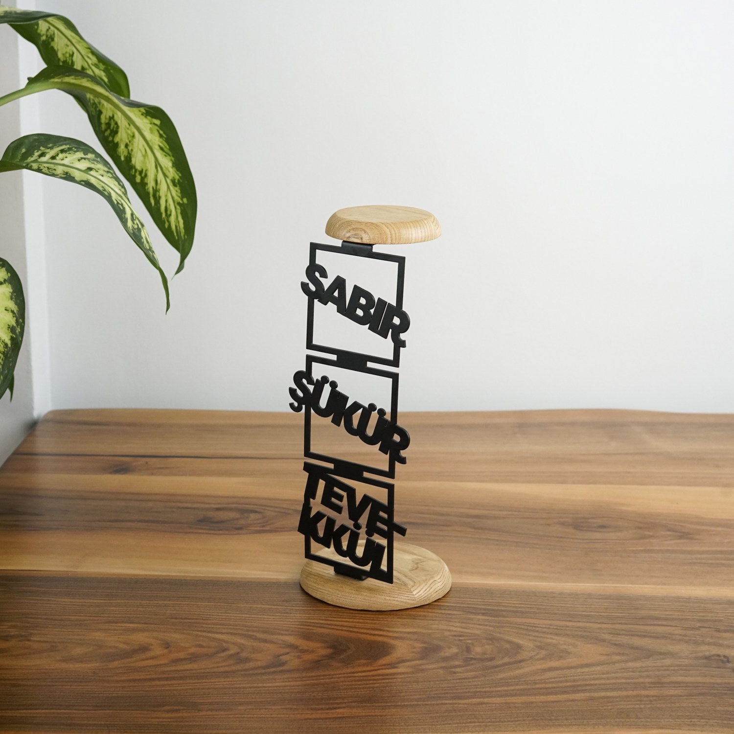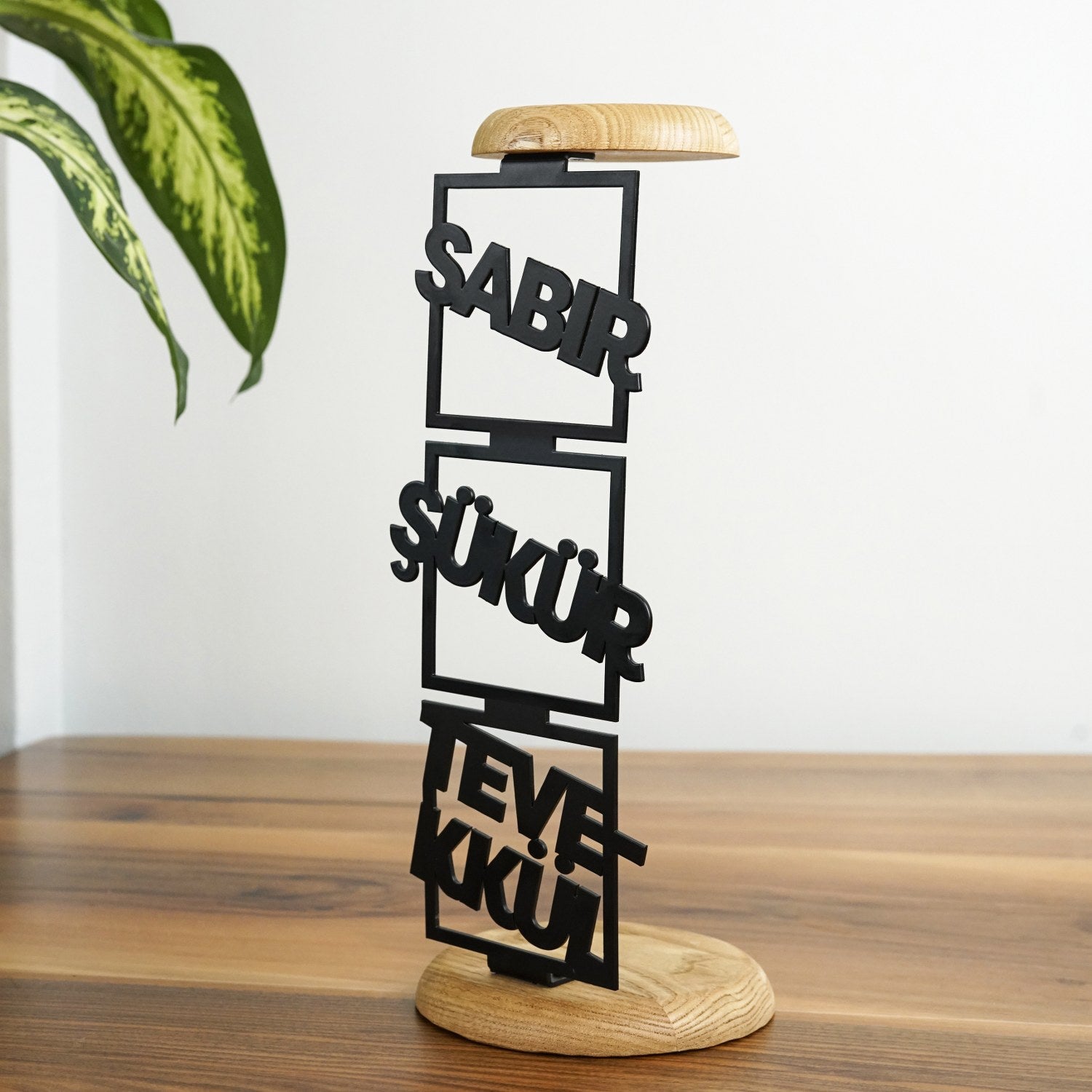 masa zerinde yer alan siyah metal kisminda dikey sekilde sabir sukur tevekkul yazan mumlugun alt ve ust standinda mum bulunuyor islamicwallarttr