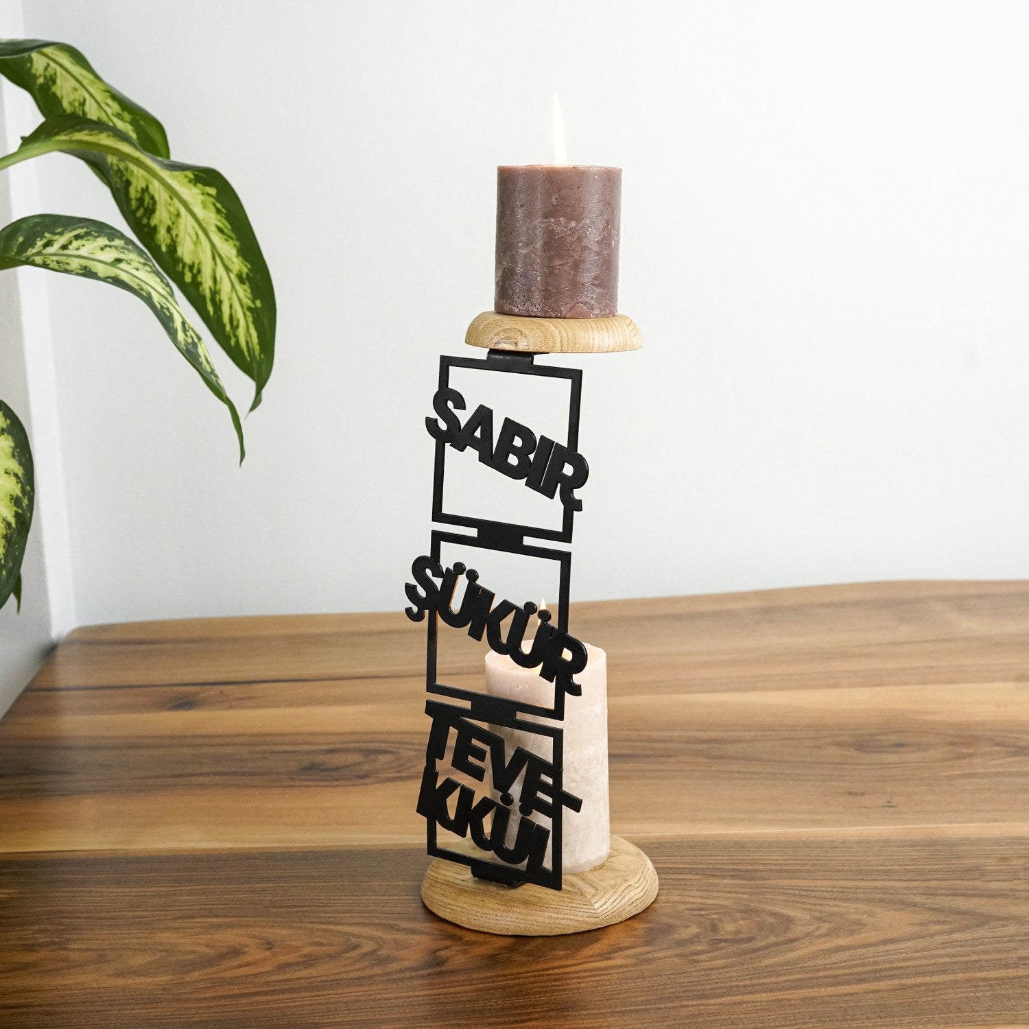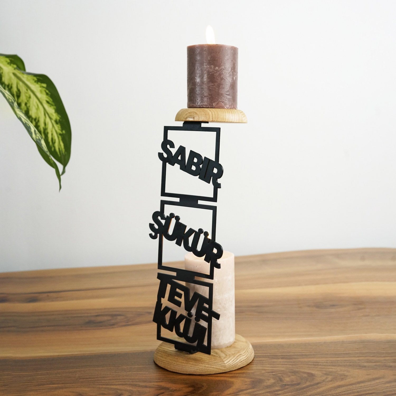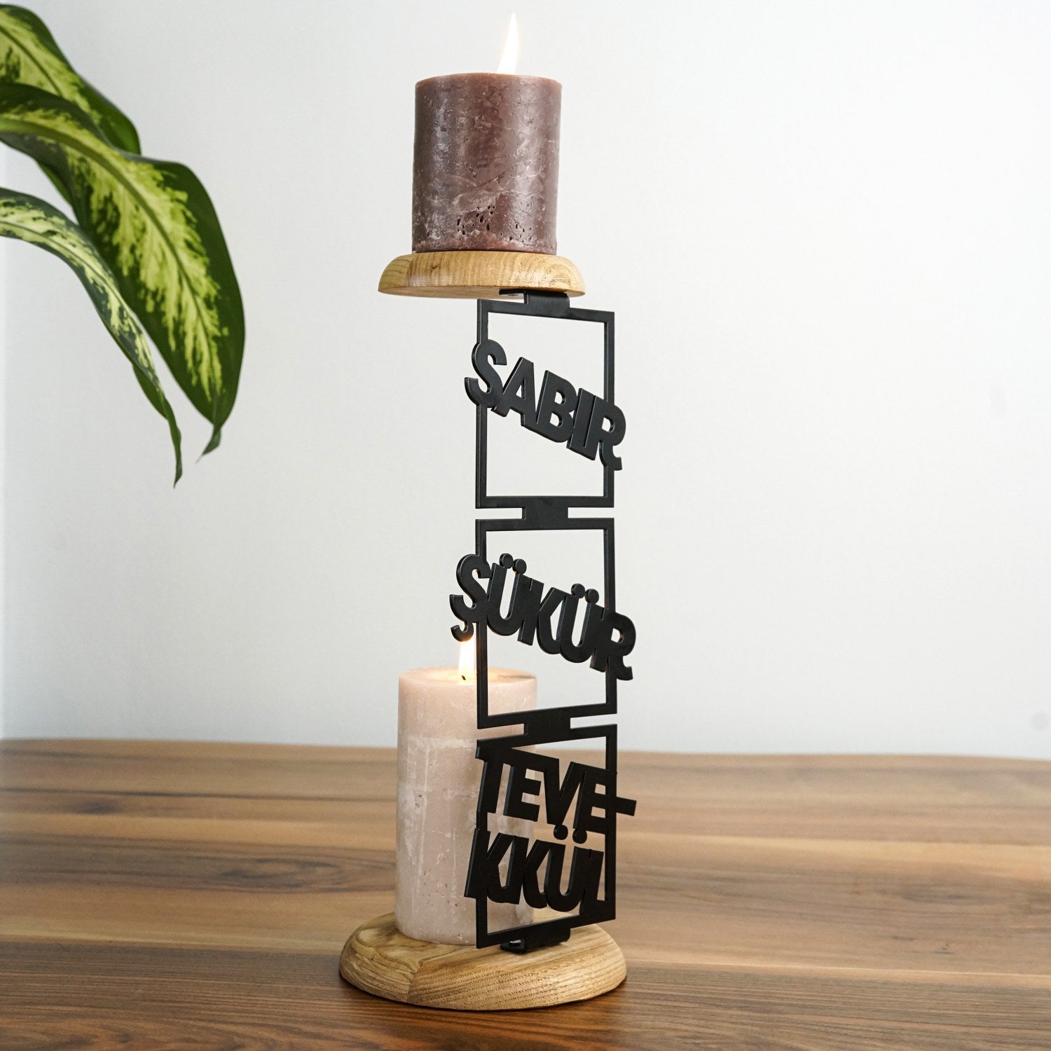 siyah metal kisminda yukaridan asagiya dogru sabir sukur tevekkul yazan alt ve ust kisminda ahsap mum koymak icin standi olan mumlugun modern tasarimi bulunuyor islamicwallarttr