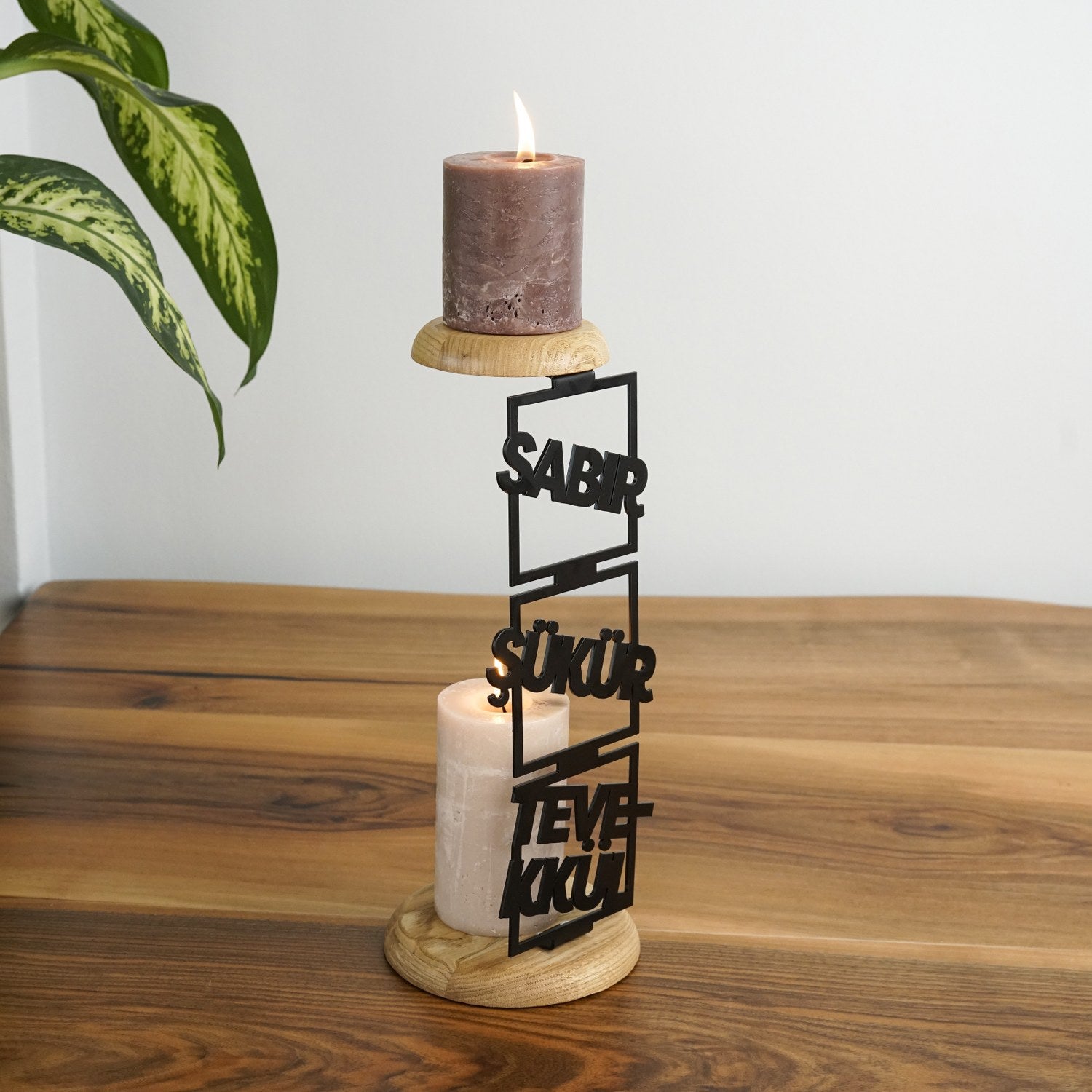 siyah metal kisminda sabir sukur tevekkul yazili mumlugun alt ve ustundeki ahsap standlarda yanan dekoratif mumlar bulunuyor islamicwallarttr