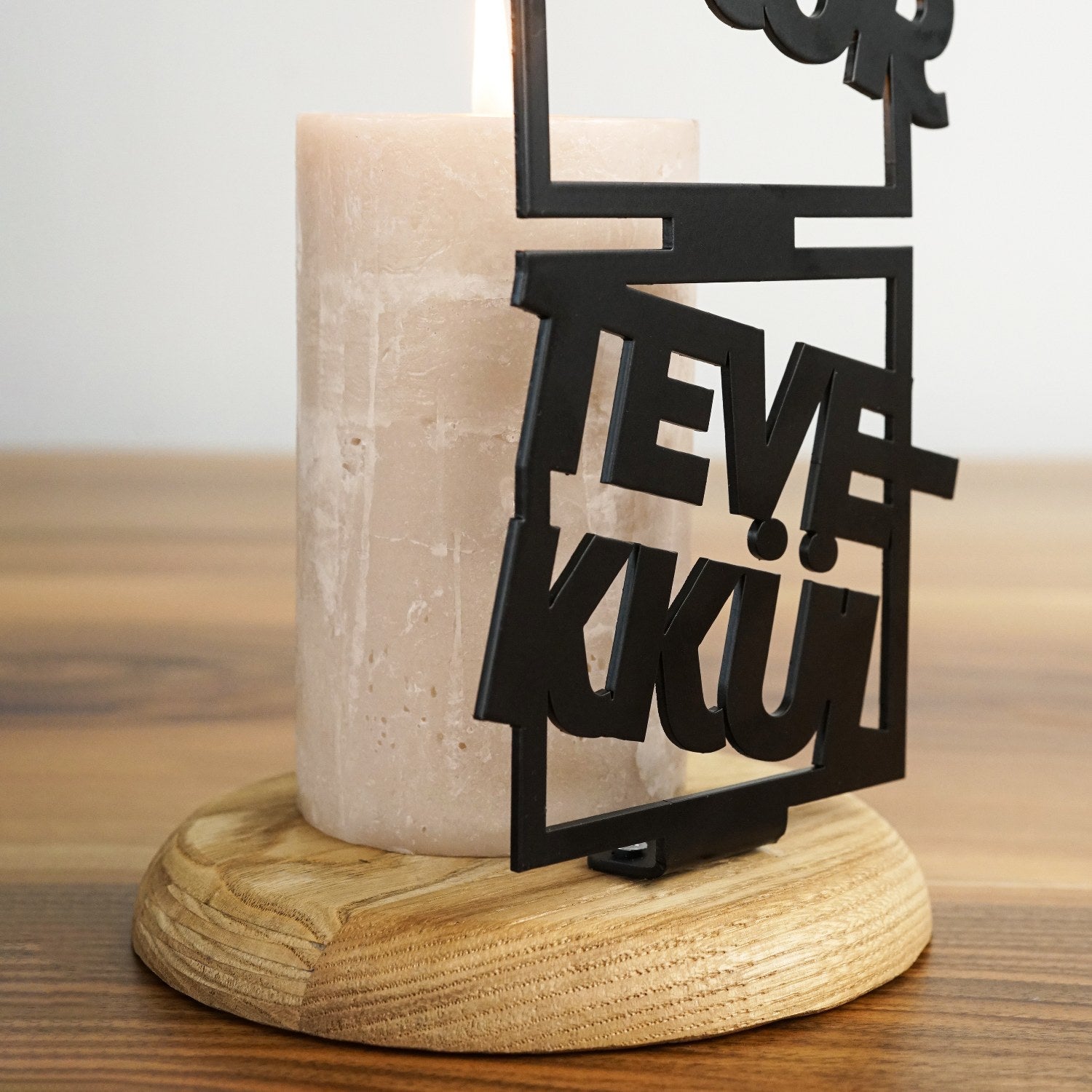 yakin plan cekimde en alttaki tevekkul yazisi ile alt ahsap standda bulunan krem rengi mum gorunuyor islamicwallarttr
